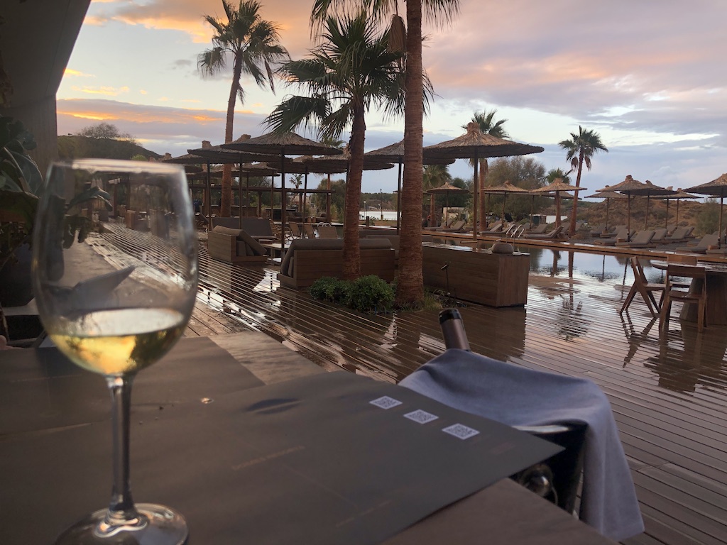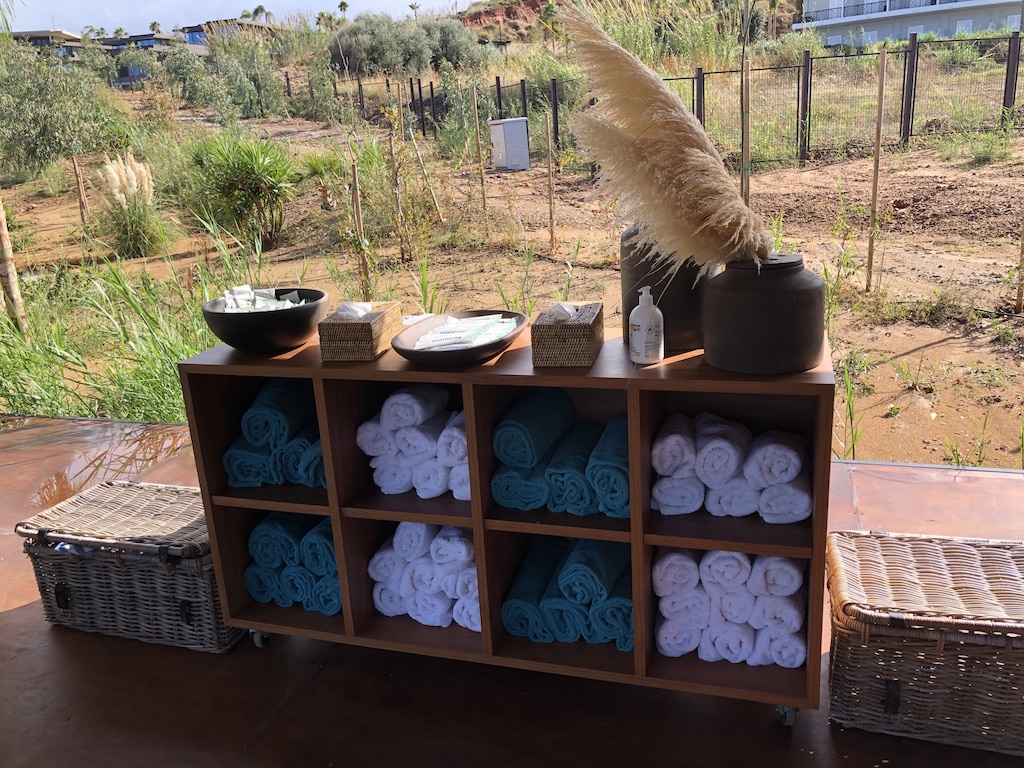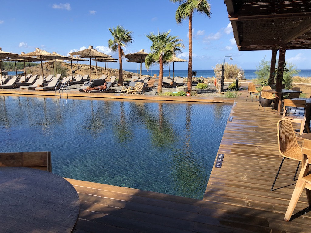 Der Hauptpool ist unmittelbar am Strand, dort gibt es Holzliegen mit ausreichend Abstand, Tische und Service-Klingelknöpfe. Eine nicht befahrene Straße trennt den Weg zum Meer, wo sich weitere Liegen befinden. Überall stehen Handtücher zur Verfügung. Am Pool sind auch die beiden Restaurants, eine Bar und Waschräume zu finden. Dort kann man sich im Falle einer späten Abreise umziehen und erfrischen.
