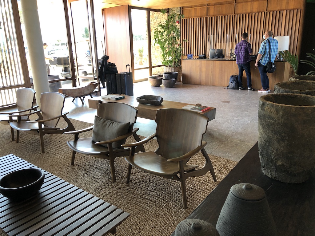 Der Empfang war sehr freundlich und warm. Statt am Tresen eingecheckt zu werden, wurden wir auf die Terrasse begleitet wo gleich Getränkewünsche abgefragt wurden. In der gemütlichen Atmosphäre füllten wir ein Gesundheitsformular aus während die Dokumente und Kreditkarte im Hintergrund kopiert wurden. In der Zwischenzeit hat uns ein Page den Schlüssel vom Mietwagen vorbeigebracht, der vor dem Hotel geparkt wurde. Eine Dame von Guest Relation kam hinzu und stellte sich vor. Sie erklärte uns, dass das Zimmer der gebuchten Kategorie schon bezugsbereit war, wir aber im Laufe des Tages einen anderen Raum erhalten könnten.