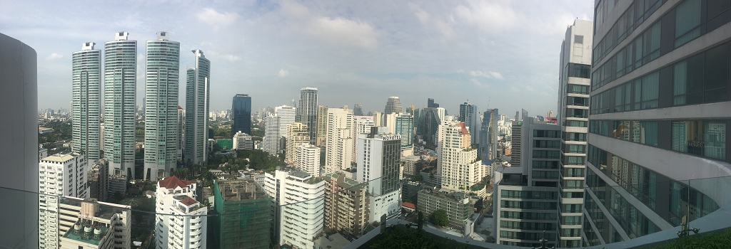 Zu unserer Überraschung wurden wir auf den 33. Stock begleitet und zu unseren Zimmern gebracht. Das „Hauptzimmer“ entpuppte sich als riesige Suite mit toller Aussicht über die Sukhumvit Area bis hinunter zum Chao Phraya. Riesig bedeutet in diesem Fall: Wohn-/Esszimmer mit Sofas und einem Essenstisch für sechs Personen, einem Gäste WC, einem begehbaren Kleiderschrank in Zimmergröße und einem sehr geräumigen Schlafzimmer. Das Bad mit Dusche und Badewanne war riesig.