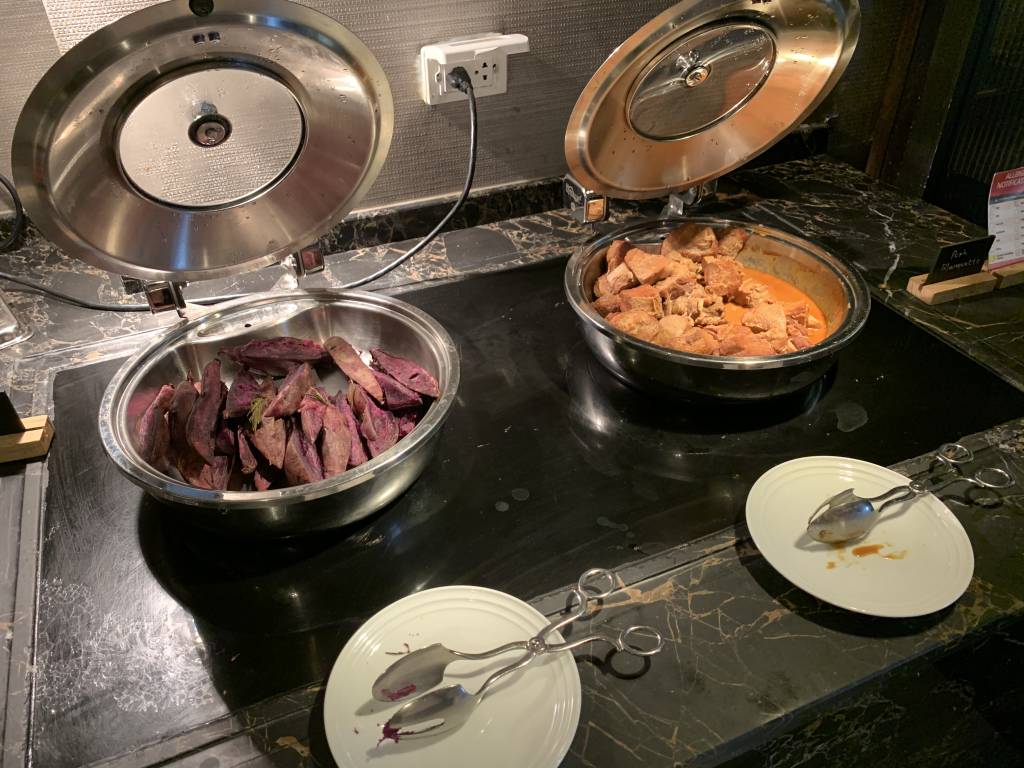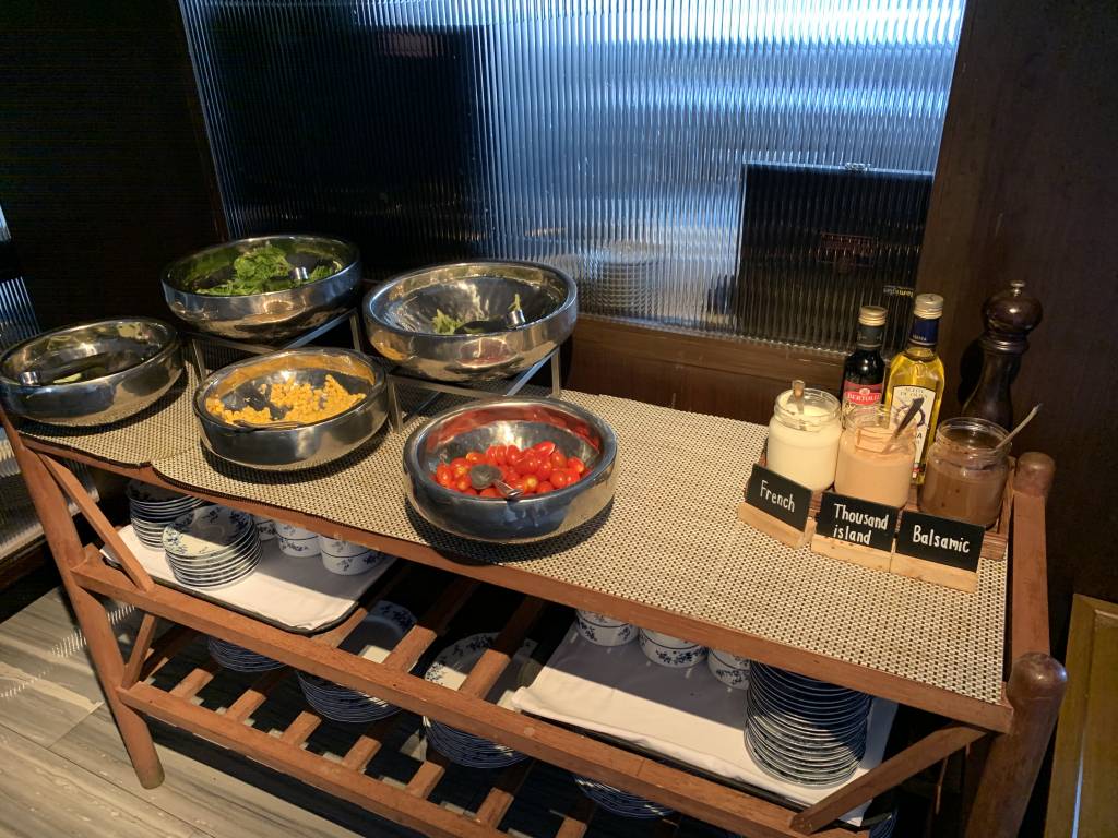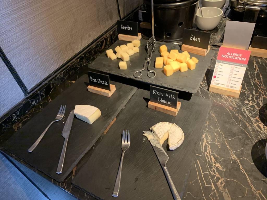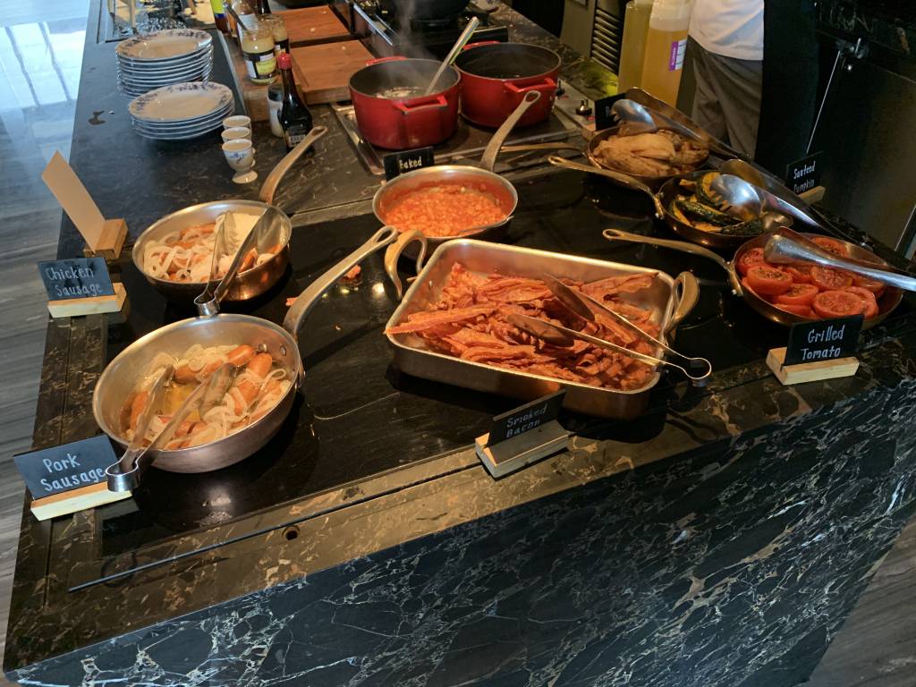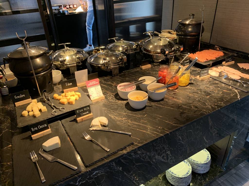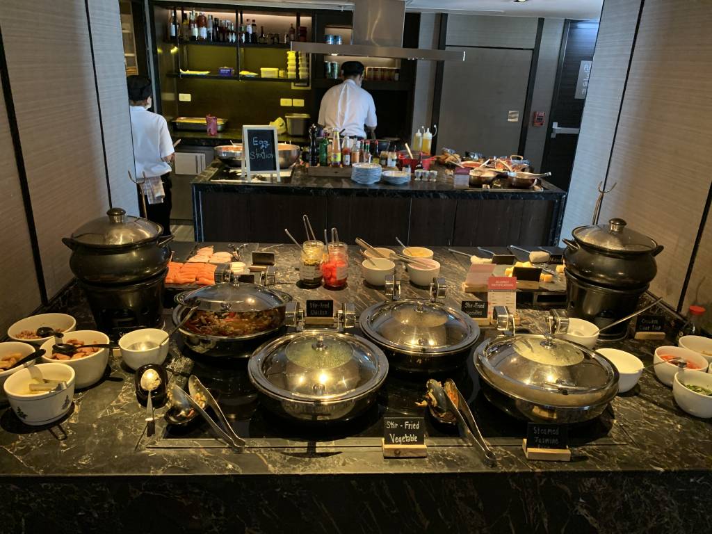 An einer Eier-Station werden frische Omelettes oder auch Eggs Benedict zubereitet. Im westlichen Frühstücks-Bereich gibt es Brot und Brötchen, sowie Wurst und Käse. Auch Würstchen, Speck und Bohnen sind am Büffet erhältlich. Darüber hinaus gibt es aber auch asiatische warme Gerichte, etwas Obst, Salat und Frühstücks-Cerealien.