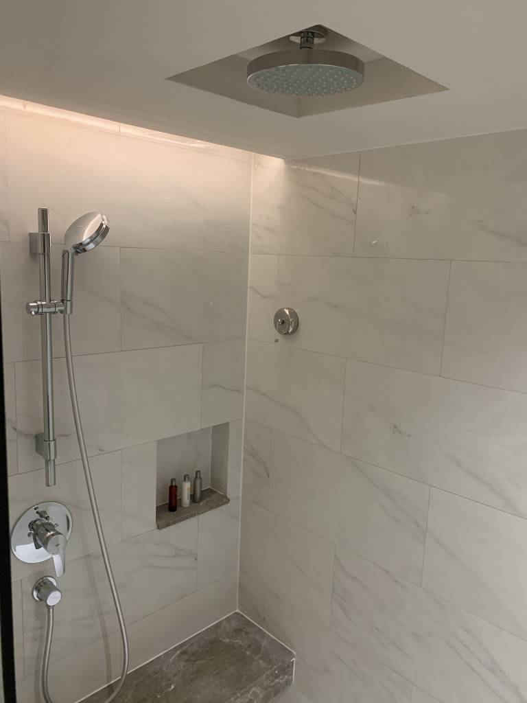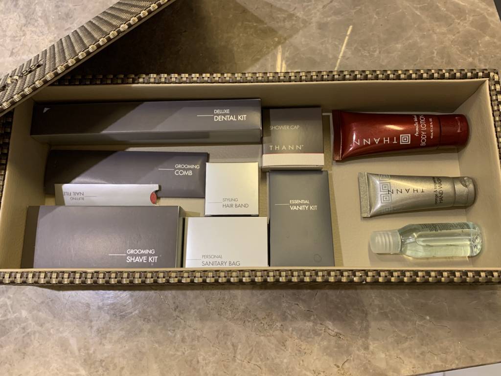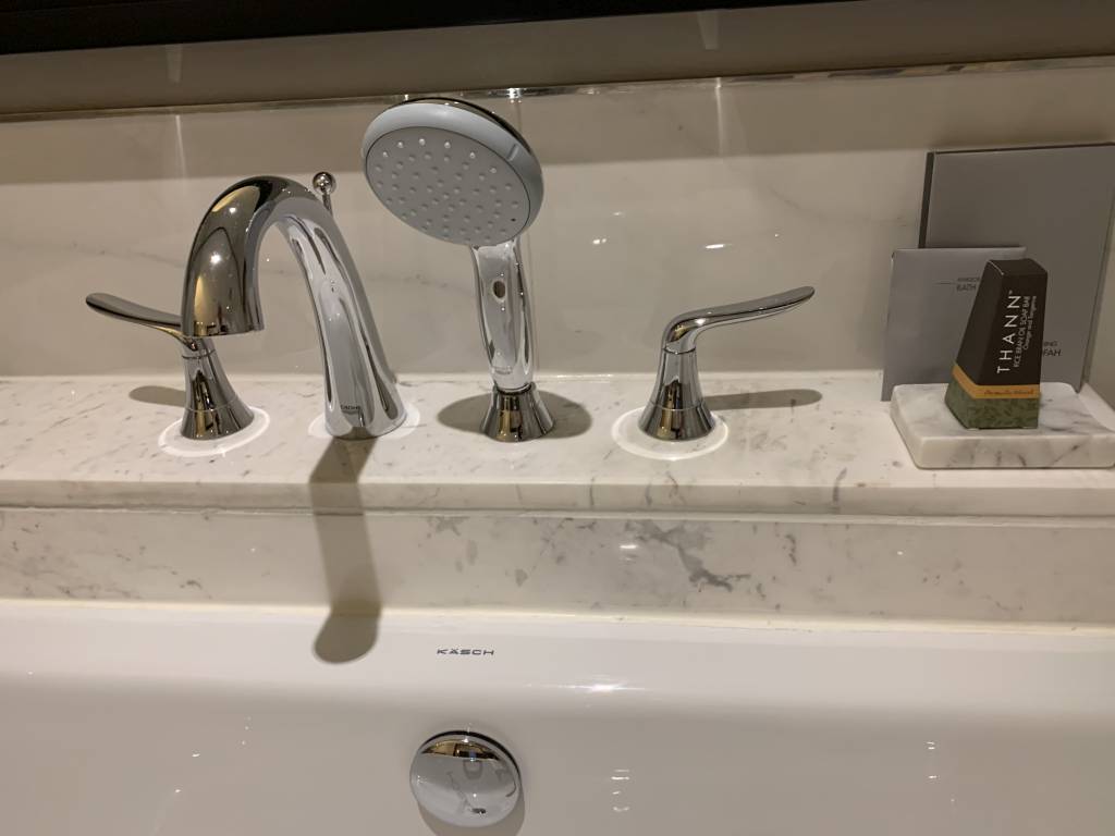Das Badezimmer der M Club Suiten ist riesig und dient gleichzeitig als Ankleidezimmer, da sich hier auch der Kleiderschrank mitsamt Bügelbrett und Bügeleisen befindet. Auch den Safe findet man hier in einem weiteren Schränken versteckt. Neben einer großen freistehenden Badewanne, die neben dem Waschtisch steht, gibt es noch eine große Dusche. Die Dusche ist mit einer Handbrause und einer Regendusche ausgestattet. Neben den klassischen Pflegeprodukten von Thann gab es diverse weitere Amenities wie Badesalz und Zahnbürsten.