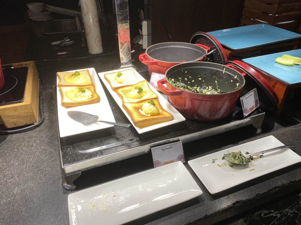 Natürlich gibt es auch alles, was ein westliches Frühstück so braucht. Von Brot und Brötchen über Aufschnitt bis hin zu Pancakes. Eierspeisen werden nochmals in einem separaten Bereich zubereitet. Hier gibt es nicht nur Klassiker wie Rührei mit Speck, sondern auch vorbereitete Eggs Benedict.