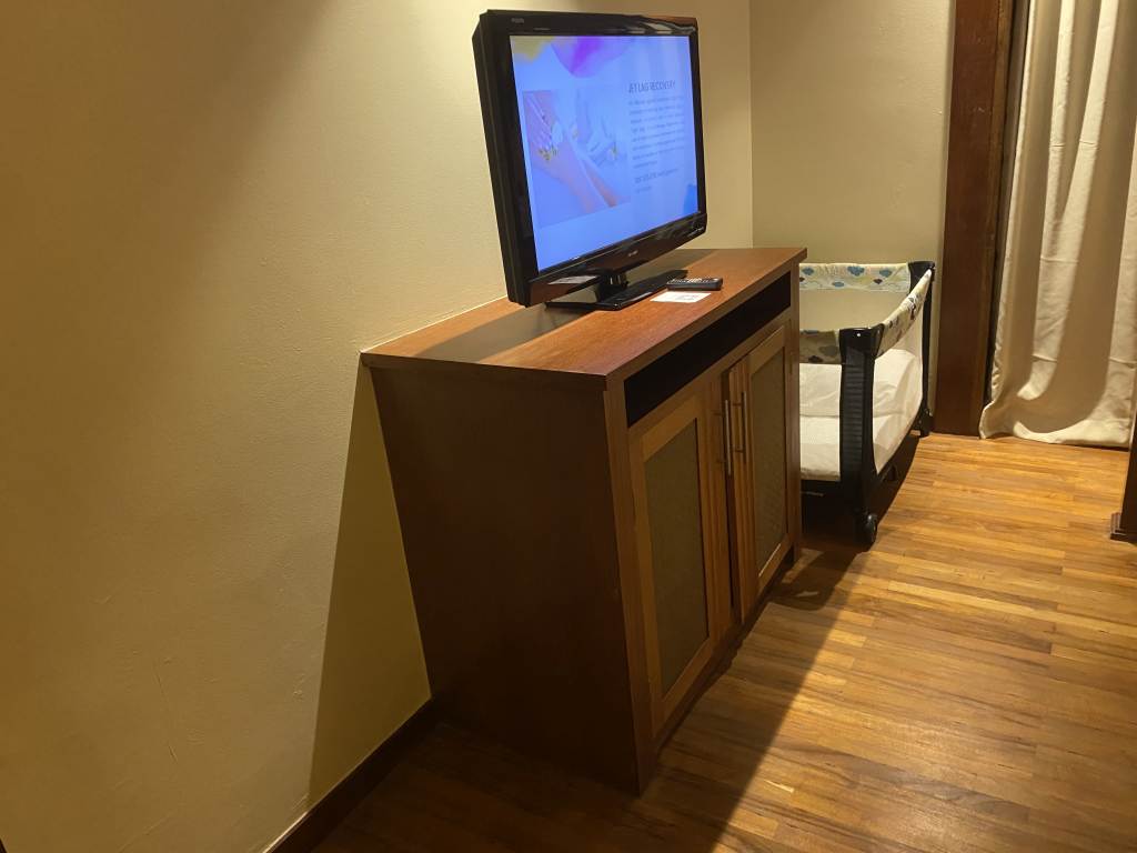 Das Schlafzimmer bot ausreichend Platz für das große Kingsize-Bett mit Himmel und die beiden dazu gestellten Babybetten, die wir natürlich wieder einmal nicht genutzt haben. Auch im Schlafzimmer befindet sich noch ein Flachbildfernseher und ein weiterer Zugang zum Balkon.