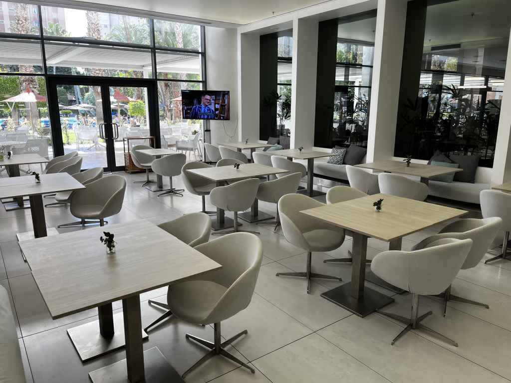 Das Restaurant gleicht einer Bahnhofshalle. Und zwar die eines Hauptbahnhofs einer Großstadt, wie wir bei unserem ersten Besuch feststellen mussten, als die Rentner eines kompletten spanischen Dorfes zu Gast im Hotel waren. Entspannter ging es dann im März 2023 zu sich, aber ein gemütliches Erlebnis stellte sich leider trotzdem nicht ein.
