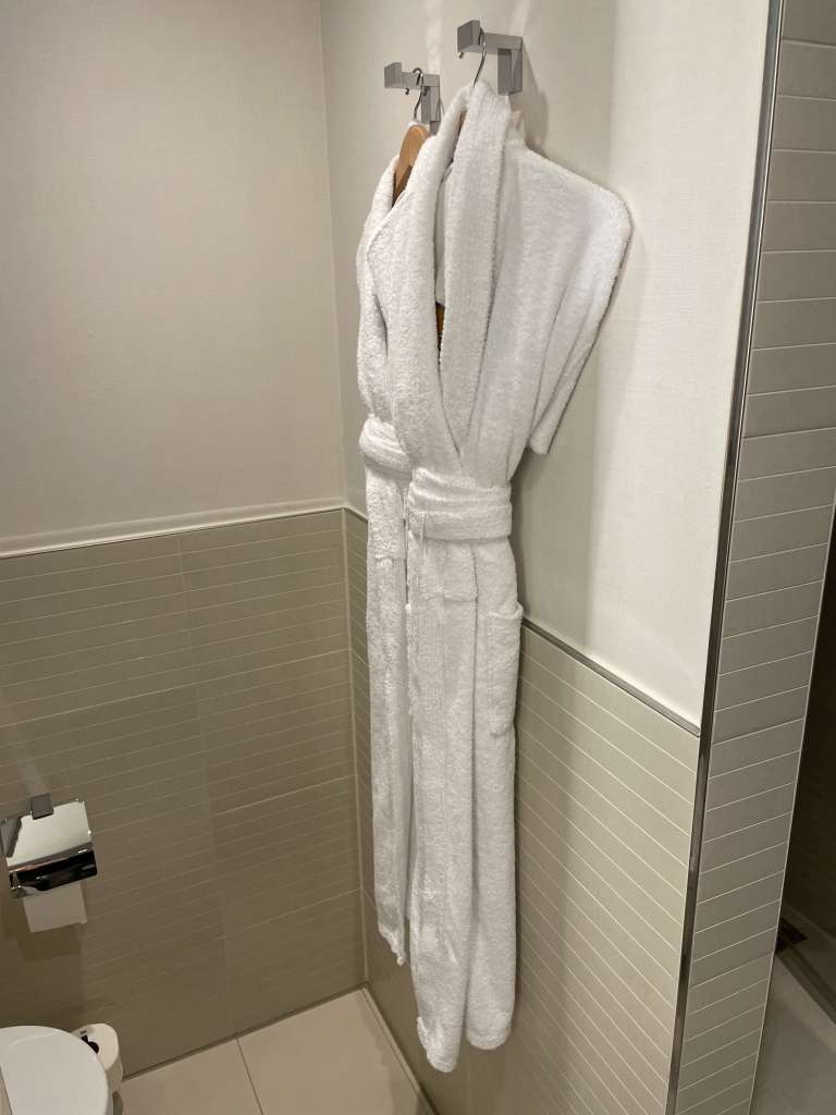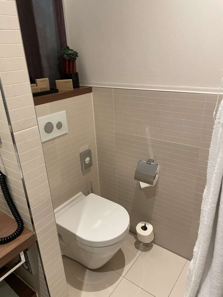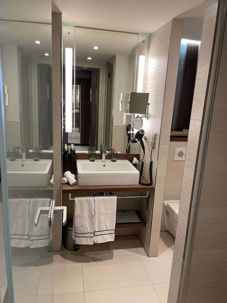 Im Bad fühlte ich mich dann doch etwas beengt. Das lag aber vermutlich daran, dass es auf relativ kleinem Raum Badewanne und Dusche gab. Ich war recht dankbar für die Entscheidung, in den vergangenen Monaten etwas abzunehmen, denn ich frage mich bis heute, wie korpulentere Menschen die Dusche nutzen sollen. Die Tür geht nur nach innen auf und die Duschkabine ist echt klein. Während das WC praktischerweise in einer Ecke versteckt war, gab es kein Bidet. Die typischen Rituals-Pflegeprodukte und einige weitere Amenities nahm ich jedoch dankend an,