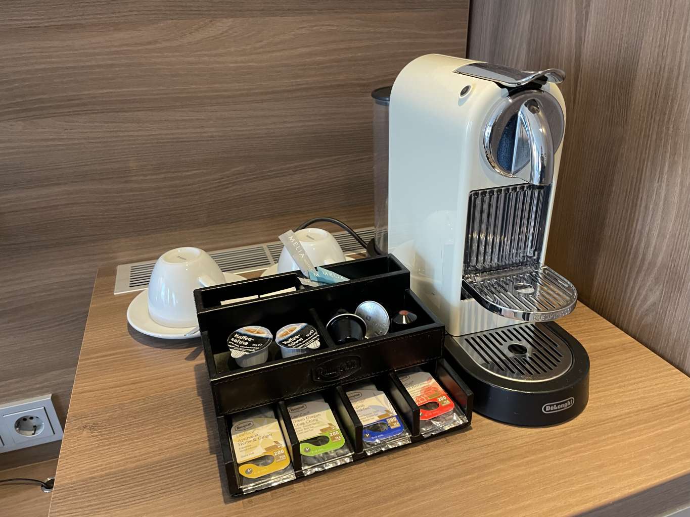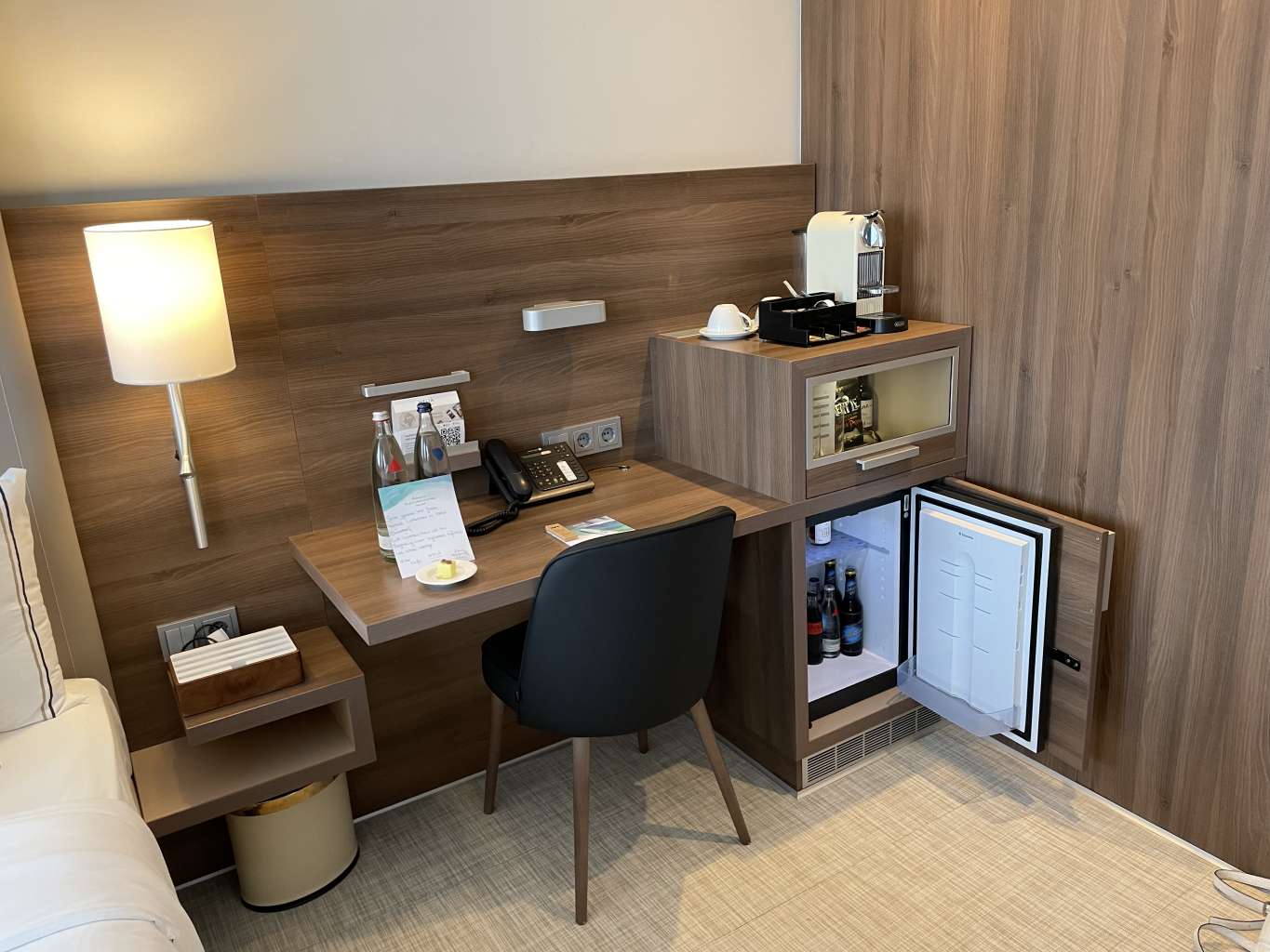 Die Junior Suite im Melia Düsseldorf wirkte allerdings etwas karg auf mich. Die Bezeichnung „Junior Suite“ ist zwar sachlich korrekt, viele Hotels bieten jedoch ähnliches als Superior Zimmer an. Der Raum war wirklich nicht riesig, wirkte aber sehr leer. Und das obowhl es alles Wichtige an Einrichtung gab. Natürlich verfügt die Junior Suite über ein großes Kingsize-Bett, welches mit ein mit Kunstleder verkleidetes Kopfelement hat, das sich fast bis zur Decke erstreckt. Natürlich bezogen mit der typischen „The Level“-Bettwäsche mit schwarzem Rahmen. Den Schreibtisch mit angeschlossener Minibar und die Kaffeemaschine, einen Welcome-Letter und zwei Pralinen fand ich direkt daneben.