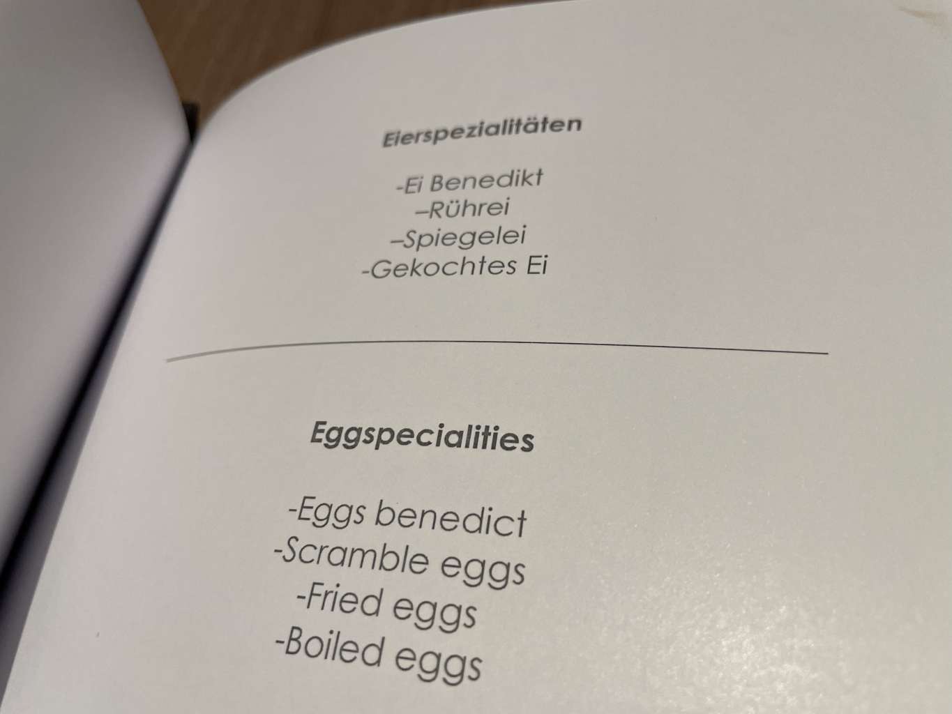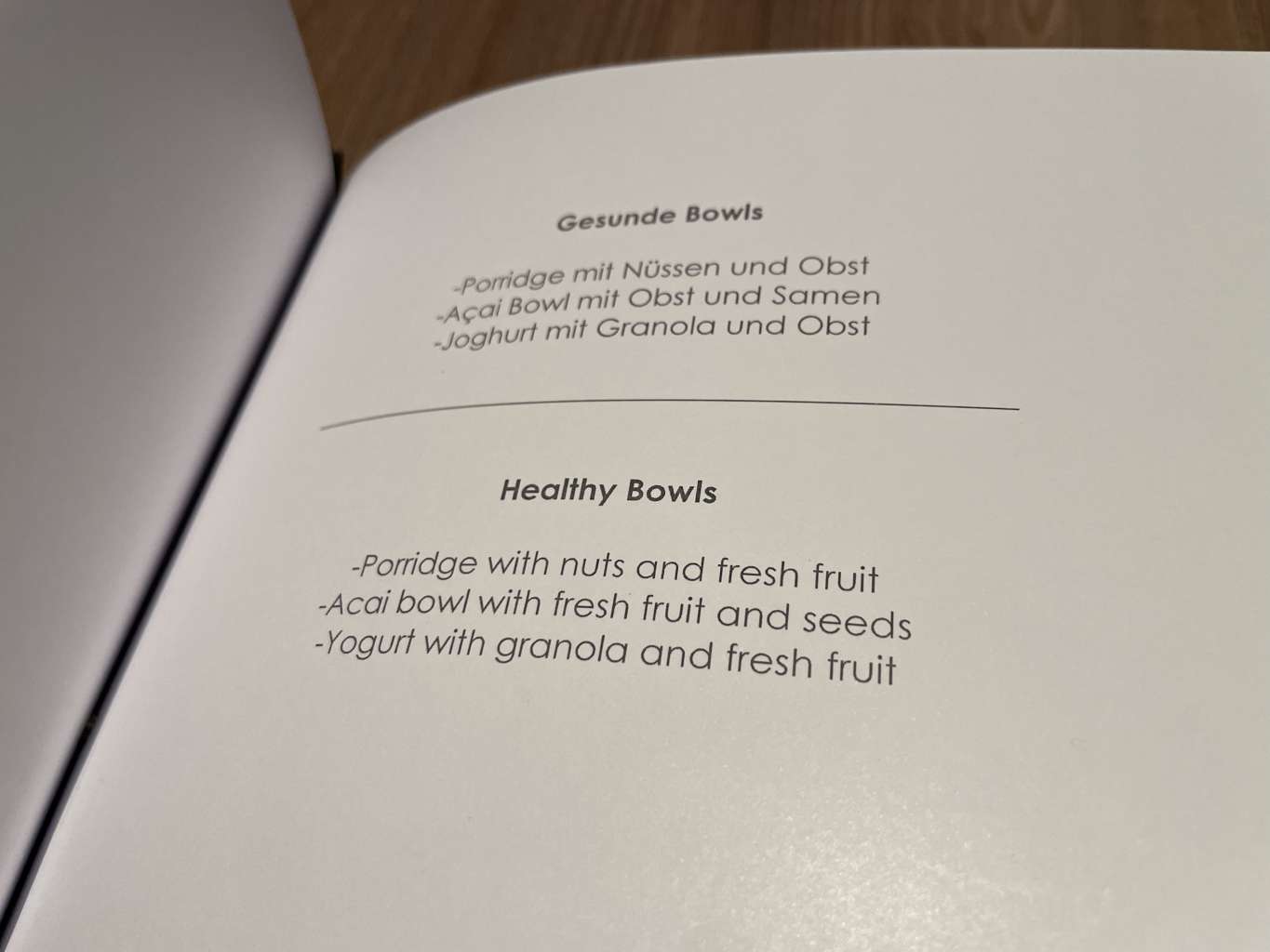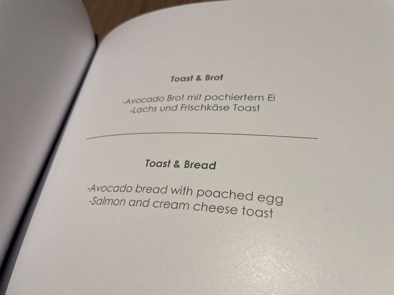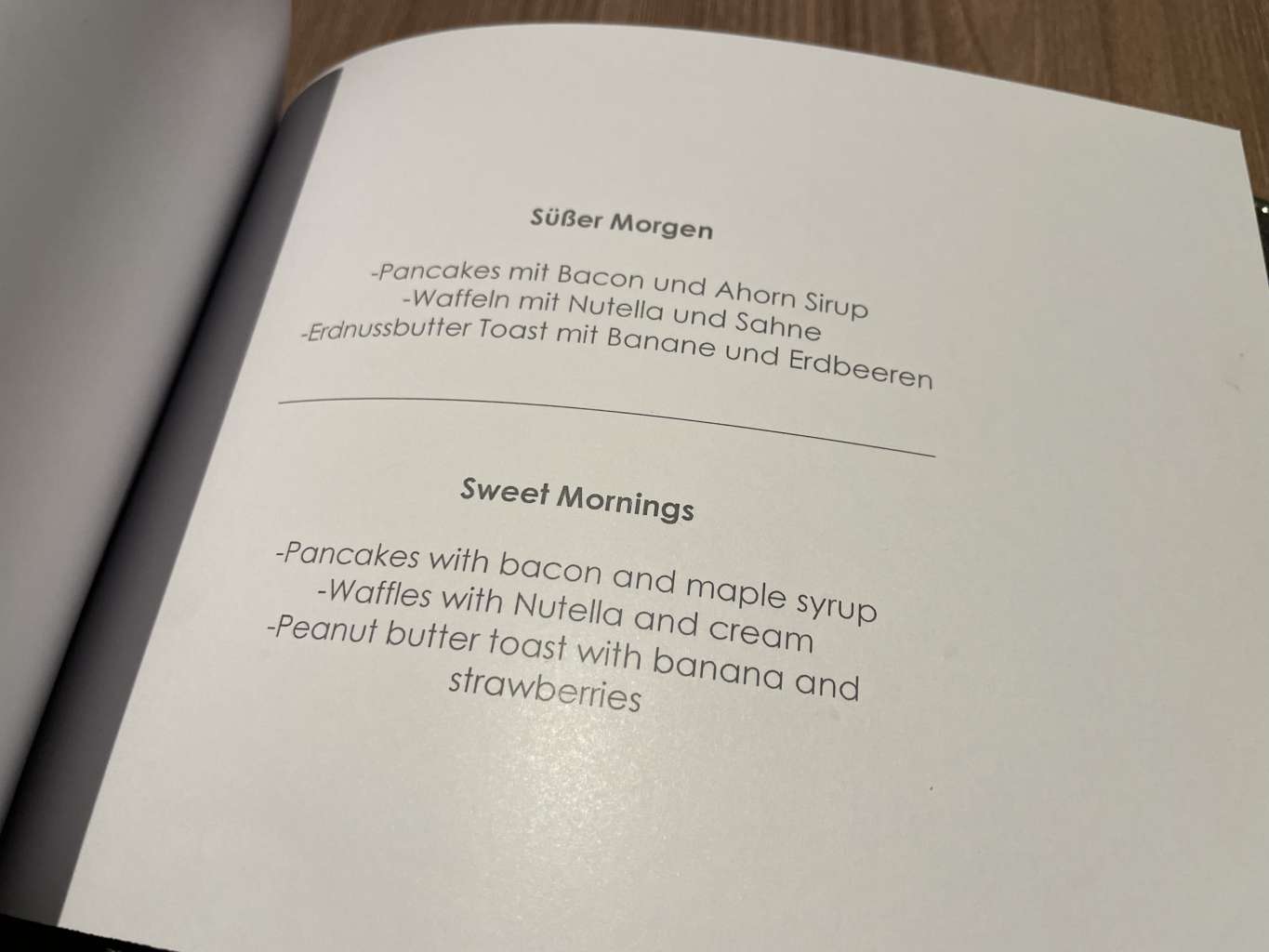 Ergänzend zum Büfett wurde auch eine Speisekarte gereicht, die in vier Kategorien unterteilt war. Unter „Süßer Morgen“ wurden Pancakes, Waffeln und Erdnussbutter-Toast und in einer zweiten Kategorie diverse Bowls angeboten. Dazu gab es unter „Toast & Brot“ Avocado-Brot und Lachs-Frischkäse-Toast. Für uns als Eierspezialitäten-Fans stand noch eine Kaegorie mit Eierspeisen zur Auswahl. Dort fand ich dann neben Rührei, Spiegelei und gekochtem Ei auch die geliebten Eggs Benedict (mit einem Berg von Speck).