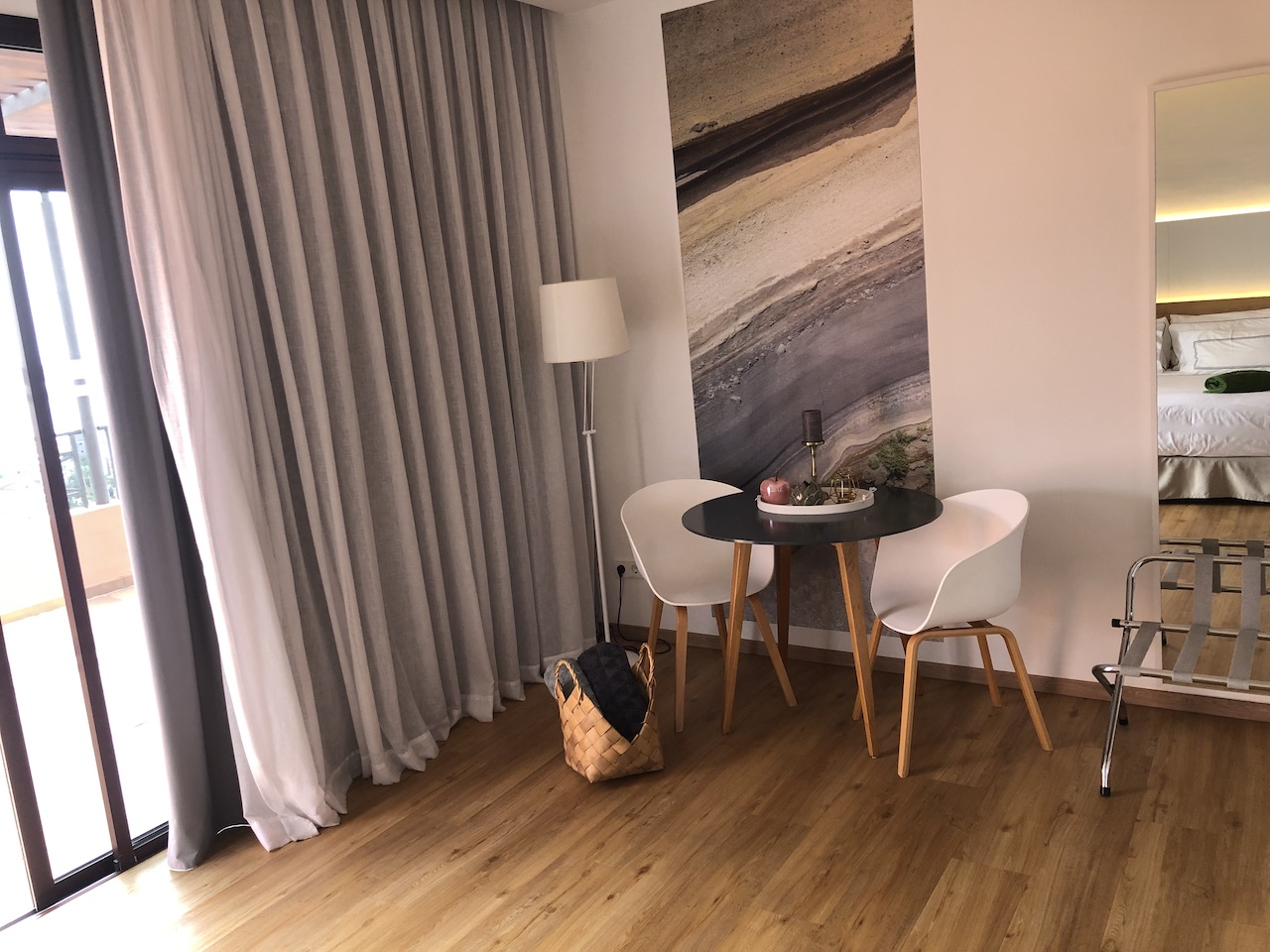 Unser Zimmer war im obersten Stockwerk des Hotels gelegen. Die in weiß gehaltene Einrichtung und die große Fensterfläche machte das Zimmer hell – was aber auch an der dachlosen Terrasse liegen mag.