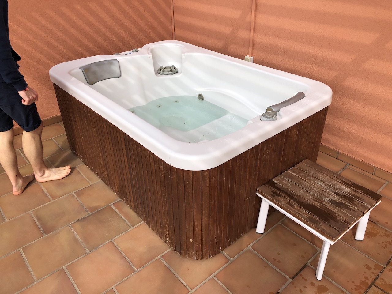 Die Terrasse ist sehr großzügig und offen. Der Blick auf die Hotelanlage, Playa de las Américas und das Meer ist vor allem zur Abendstunde schön. Leider waren die Sonnenliegen und der Sonnenschirm abgenutzt und lieblos abgestellt worden. Der von uns sehnlichst erwartete Jacuzzi hatte schon bessere Zeiten gesehen. Der Wasserstrahl, der sogenannte „Jet“, sowie die Whirpoolfunktion versagten ab und zu.