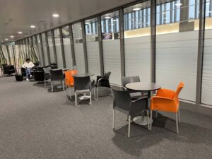 Da die Melli-Beese Lounge nach innen hin liegt, habt Ihr keinen Blick auf das Vorfeld. Eine Lounge ohne Fenster und nur mit Tageslicht durch die Fenster zum Abflugbereich, das ist nicht mein Fall.
