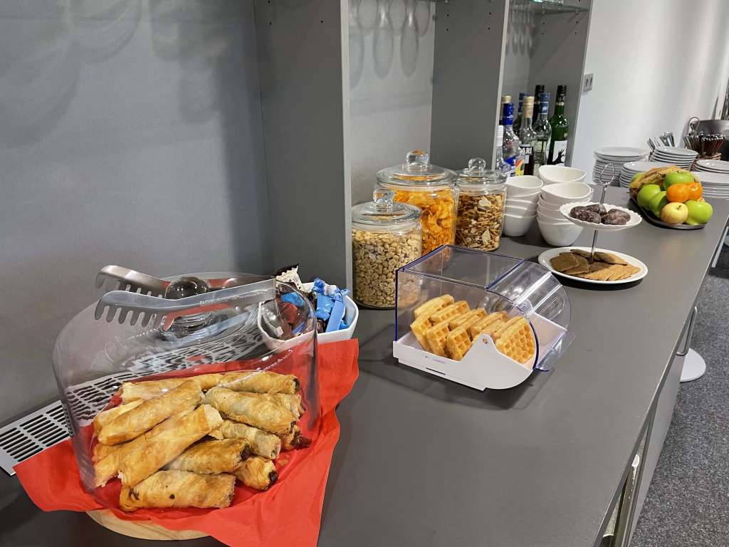 Zum Frühstück angeboten wurde Toast, gekochte Eier, Waffeln, Börek, Cornflakes, Fruit-Loops, Scheibletten-Käse, Streichwurst, Kekse, Joghurt, Obst und Chips. Zusätzlich gibt es noch eine Warmhalteplatte, die mir in Kombination mit der Zange eine Ahnung gab, dass es tagsüber zusätzlich Bockwürstchen gibt.