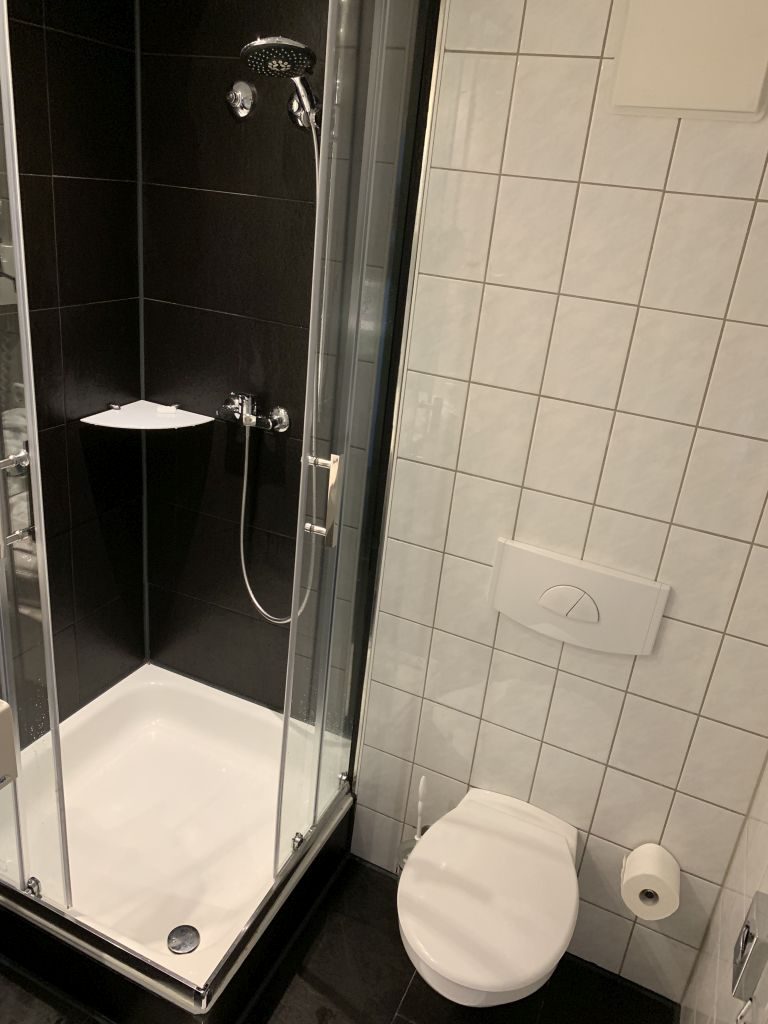 Das Badezimmer war recht klein. In der Ecke befand sich die Dusche, rechts davon das WC und wiederum links das Waschbecken mit einem Spiegel. Während in der Dusche die Seife in einem Spender bereit stand, lagen auf dem Waschtisch ein paar einzeln verpackte Artikel, wie Duschhauben und Seifen.