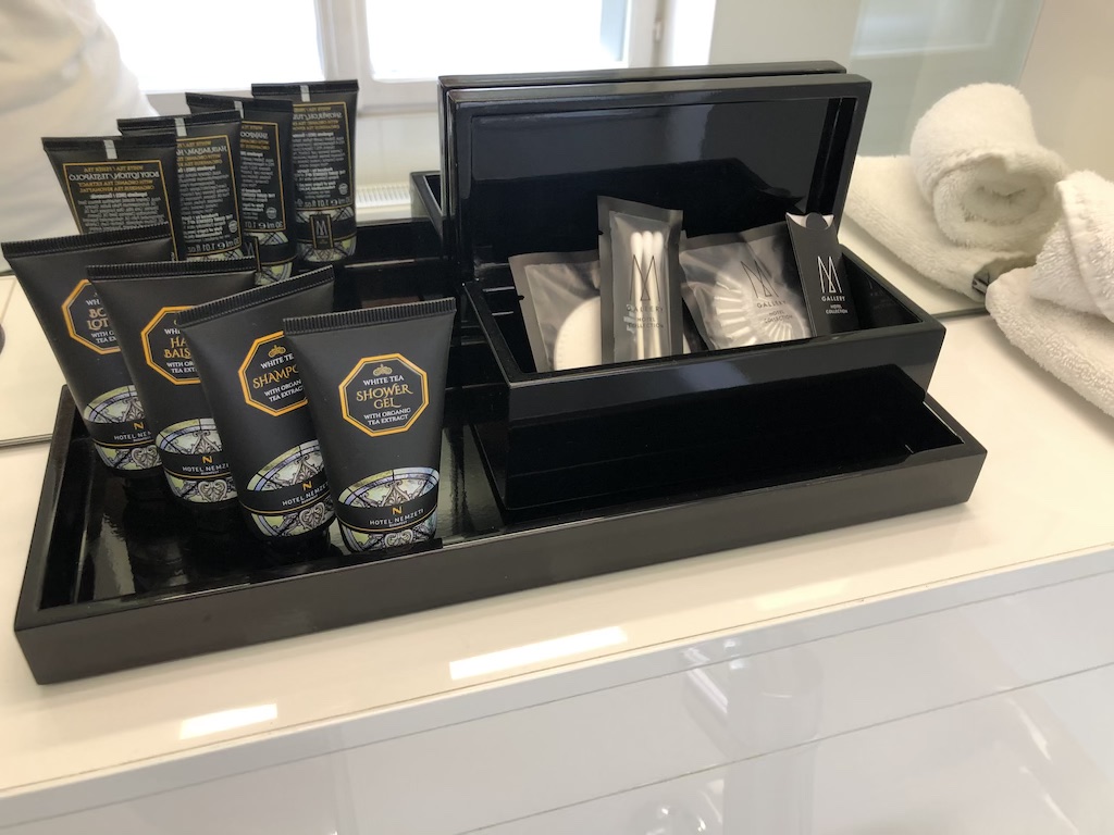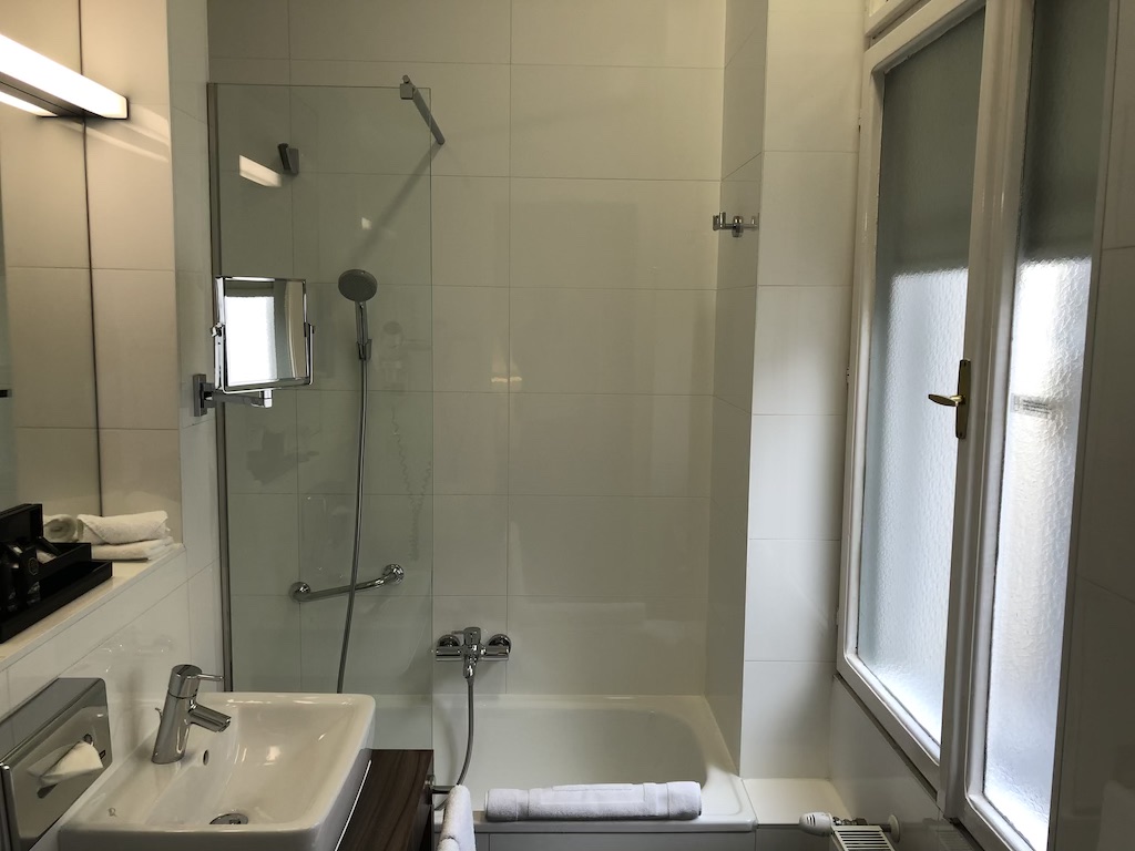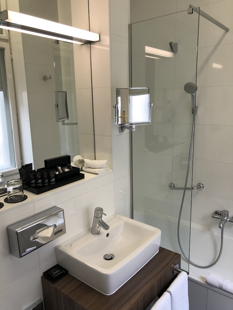 Das Badezimmer ist im Verhältnis etwas klein geraten. Dafür war darin ein Fenster zum ruhigen Innenhof. Die üblichen Kosmetika wie Duschgel, Schampoo und Pflegeartikel standen bereit. Ich hatte meine Zahnbürste vergessen, eine neue wurde mir wenige Augenblicke später kostenfrei aufs Zimmer gebracht.