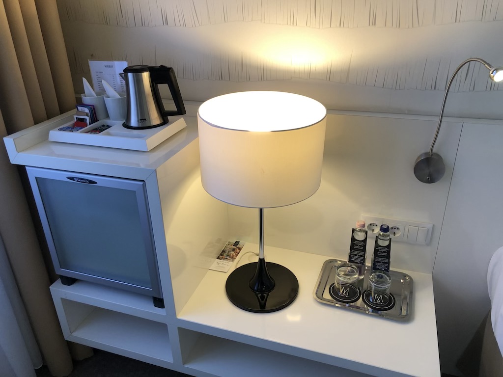 Die Minibar war leer aber eingeschaltet. Daneben eine Übersicht über die über den Zimmerservice bestellbaren Getränke und Snacks. Wasserkocher mit Kaffee und Tee sowie zwei kleine Flaschen Wasser sind kostenfrei.
