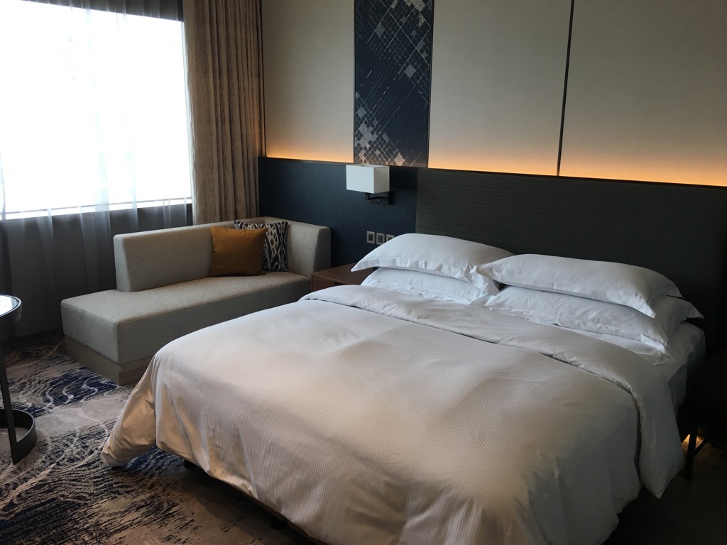 Hinter dem Bad befand sich das gemütliche King Size Bett Dieses war mit einer großen Bettdecke und mit mehreren Kissen unterschiedlicher Härte ausgestattet. Eigentlich habe wir hier ganz gut geschlafen, allerdings lag eine Wand unseres Zimmers direkt an den Aufzügen, weswegen es ständig rauschte, als würde am Zimmer eine Windböe vorbeipfeifen.