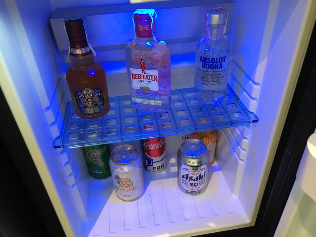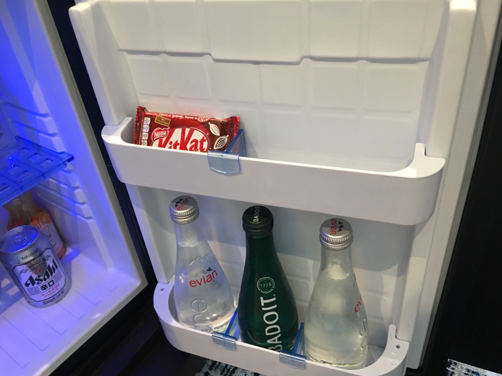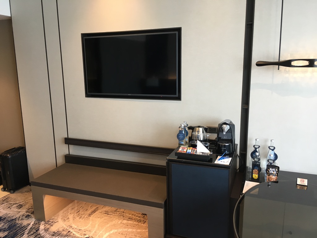 Gegenüber des Bettes befand sich noch ein Schreibtisch, der Fernseher, die Minibar mit Tee und Kaffee Station und Ablagefläche für einen Koffer. Das Zimmer war mit ausreichend Steckdosen ausgestattet, damit man alle seine mitgebrachten Geräte laden konnte.