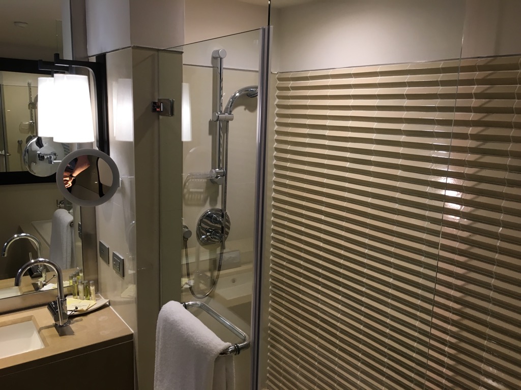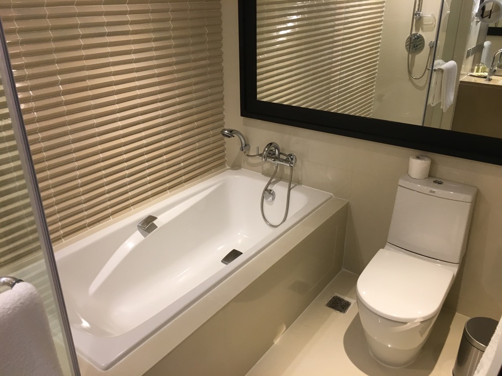 Direkt daneben befand sich das Badezimmer. Dieses war mit Dusche, Badewanne, Toilette und einem Waschbecken ausgestattet. Ich finde es in Kettenhotels immer sehr angenehm, dass viele Handtücher bereit liegen. Natürlich war das Bad auch mit den übrlichen Amenities von Peter Thomas Roth ausgestattet.