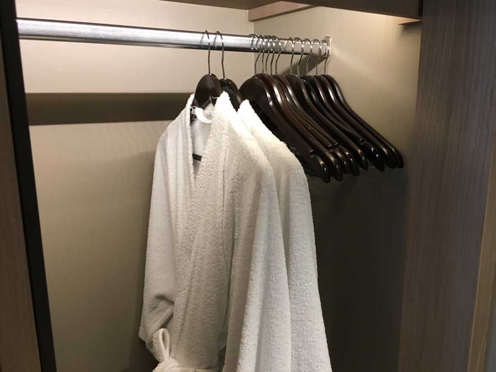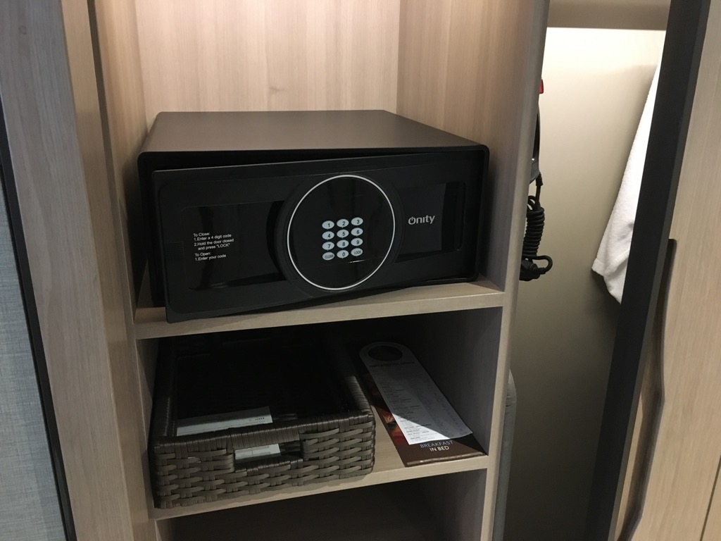 Nach dem Betreten befand sich auf der rechten Seite direkt der Kleiderschrank, der mit den üblichen Dingen wie Slipper, Bügelbrett und Safe ausgestattet war.