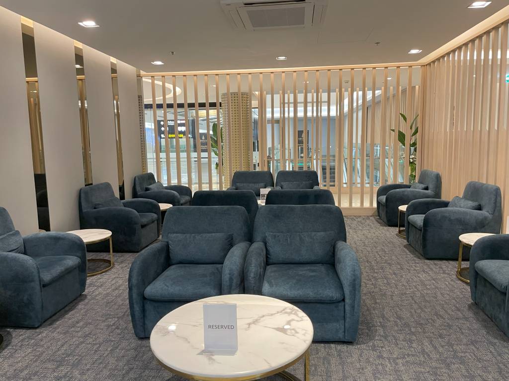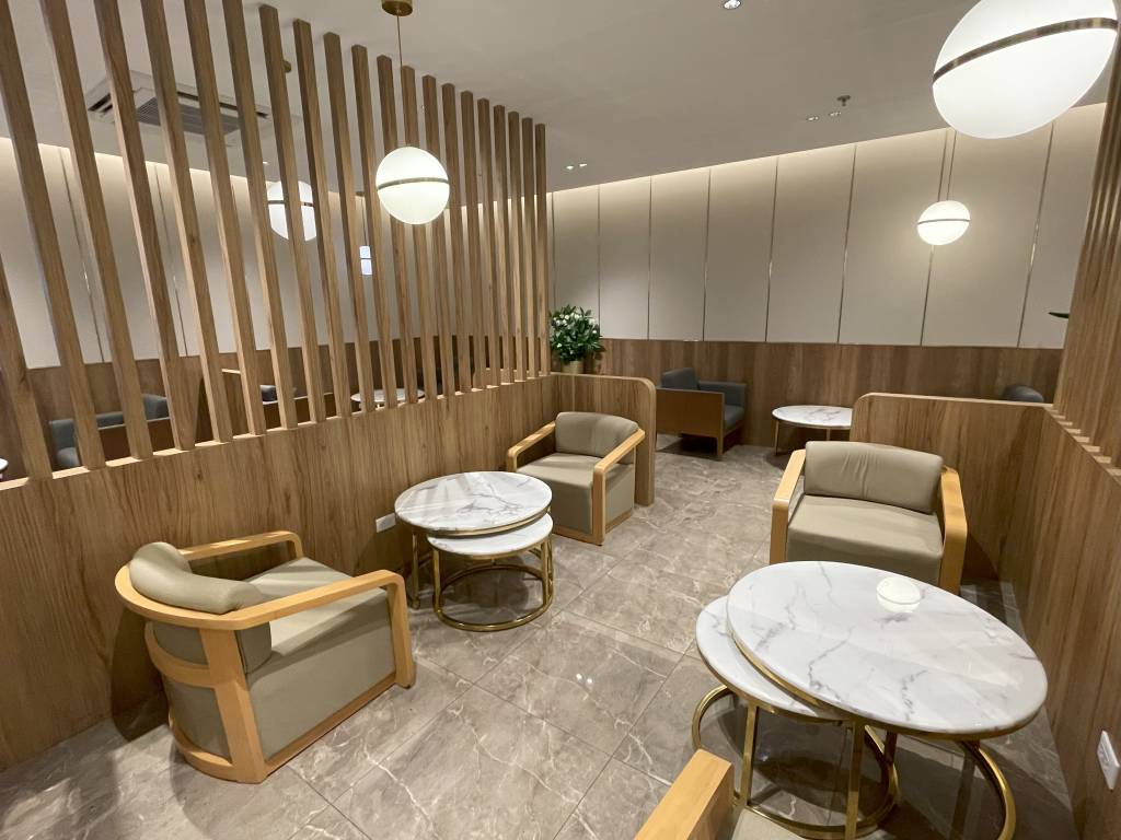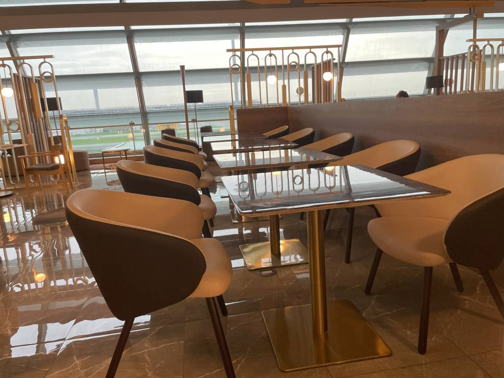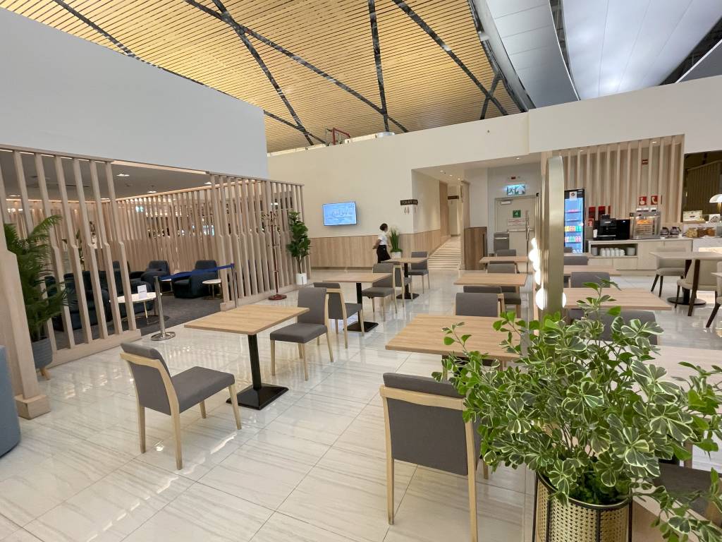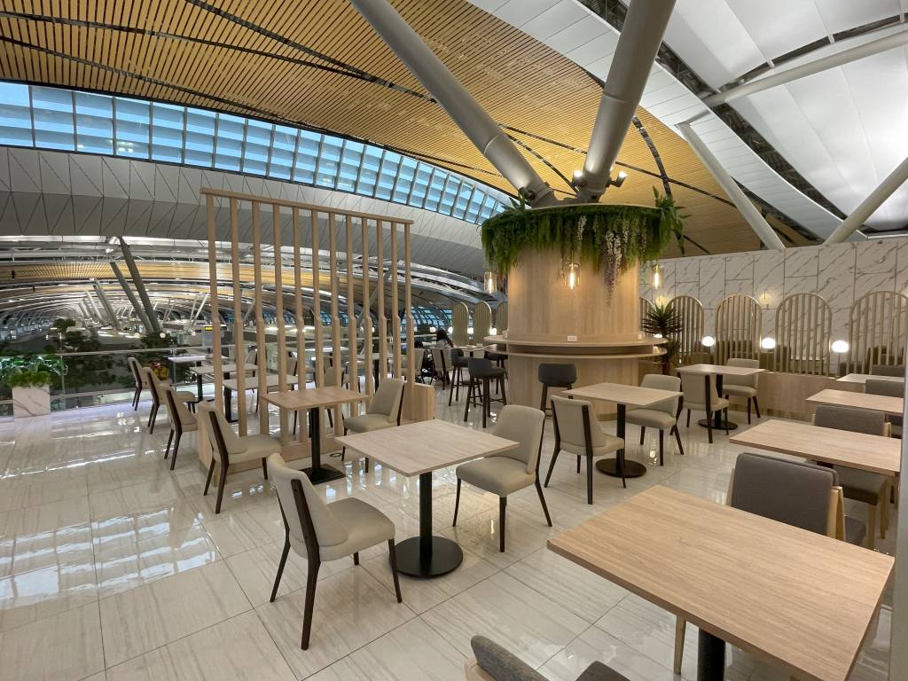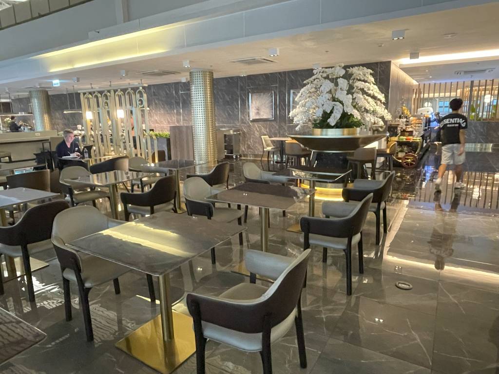 In weiten Teilen identisch ausgestattet ist die Miracle Lounge Business. Lediglich die Anordnung ist aufgrund der Bauweise des Terminals etwas anders. Nach dem Eingangsbereich spazieren Gäste zwischen hölzernen Trennwänden in Richtung Haupt-Büfettbereich. Wer zuvor rechts abbiegt, landet in einem offener gestalteten Teil der Lounge, der ebenfalls als Büfett genutzt werden kann. Bei meinem Besuch blieb dieser Teil des Büfetts jedoch ungenutzt, sodass sich hier nur vereinzelt Gäste aufhielten. Diese konnten jedoch aus der Distanz das Treiben im Terminal verfolgen.