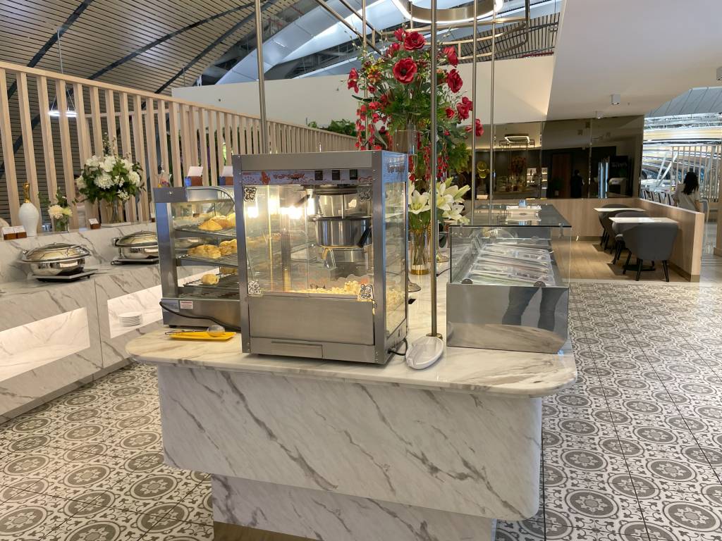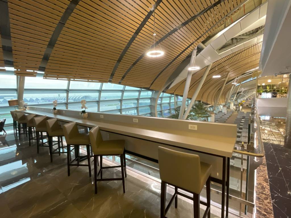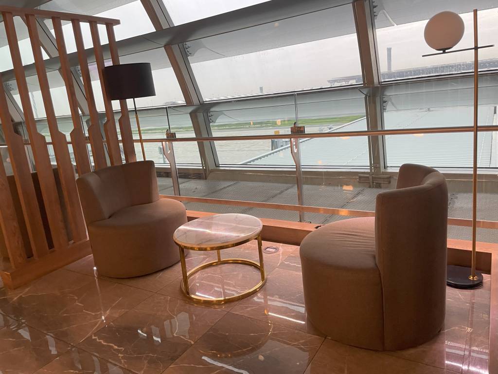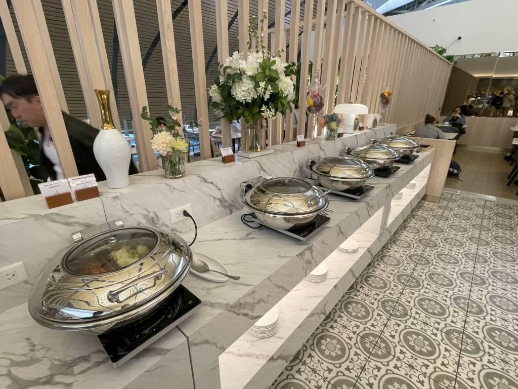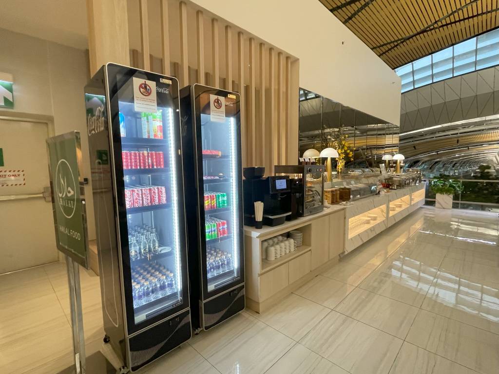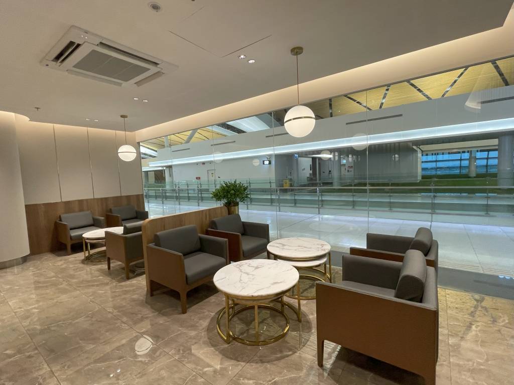 In weiten Teilen identisch ausgestattet ist die Miracle Lounge Business. Lediglich die Anordnung ist aufgrund der Bauweise des Terminals etwas anders. Nach dem Eingangsbereich spazieren Gäste zwischen hölzernen Trennwänden in Richtung Haupt-Büfettbereich. Wer zuvor rechts abbiegt, landet in einem offener gestalteten Teil der Lounge, der ebenfalls als Büfett genutzt werden kann. Bei meinem Besuch blieb dieser Teil des Büfetts jedoch ungenutzt, sodass sich hier nur vereinzelt Gäste aufhielten. Diese konnten jedoch aus der Distanz das Treiben im Terminal verfolgen.