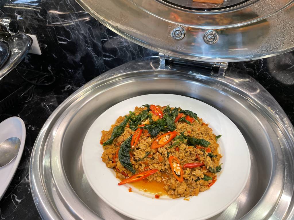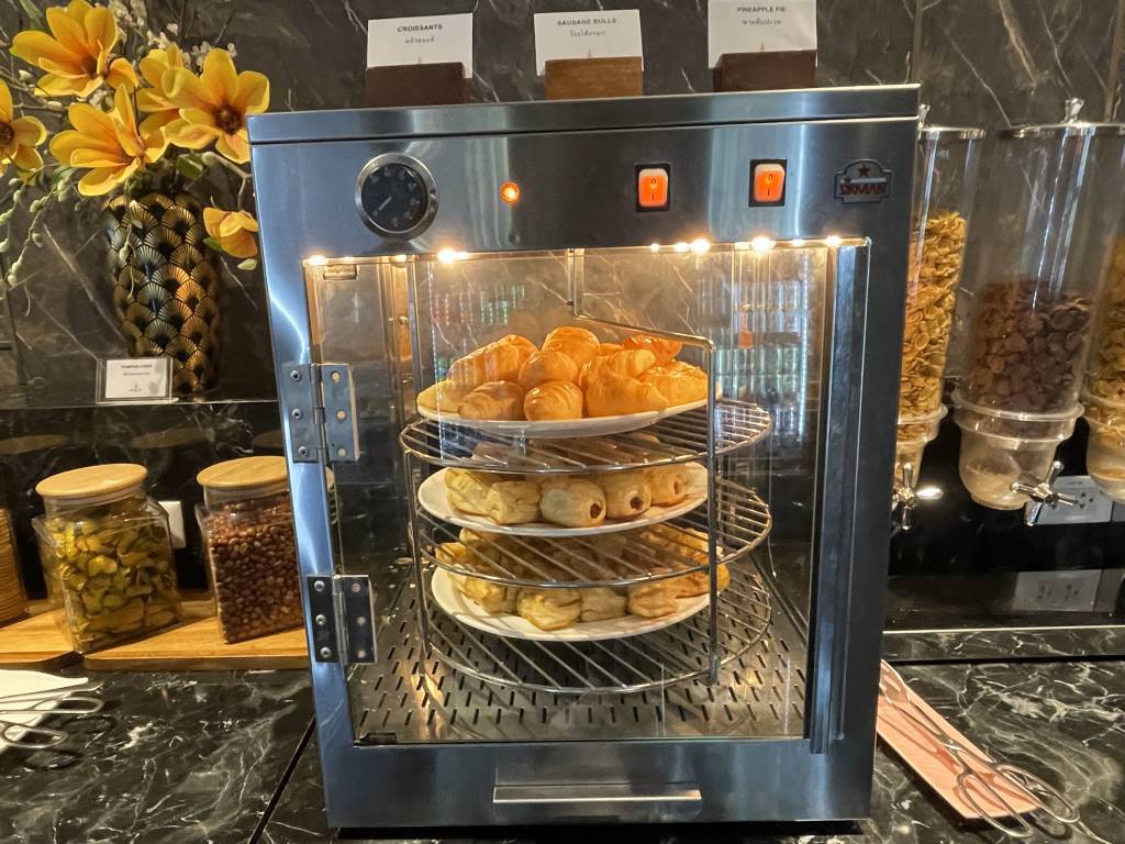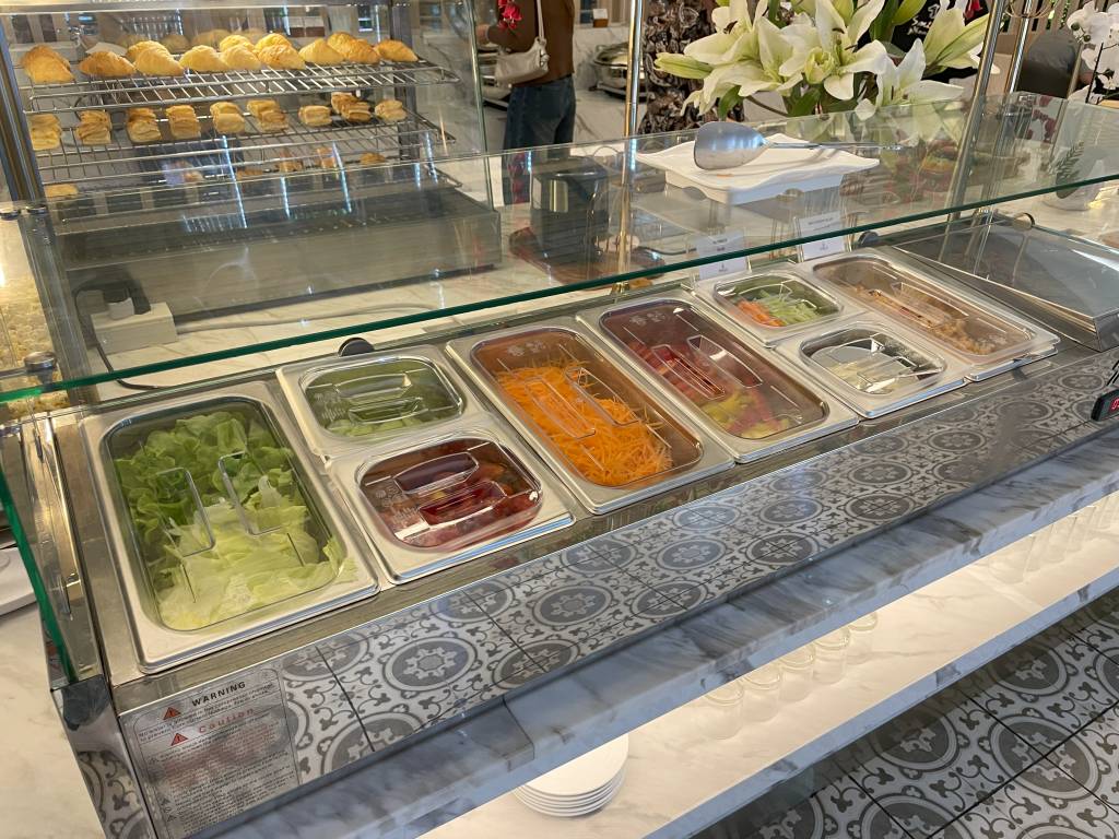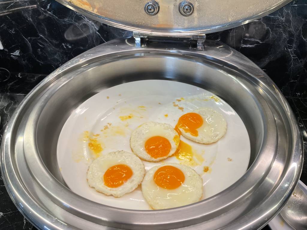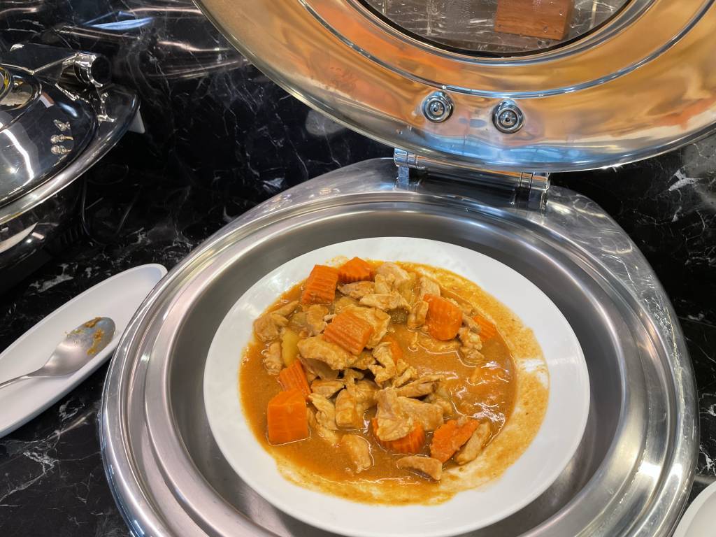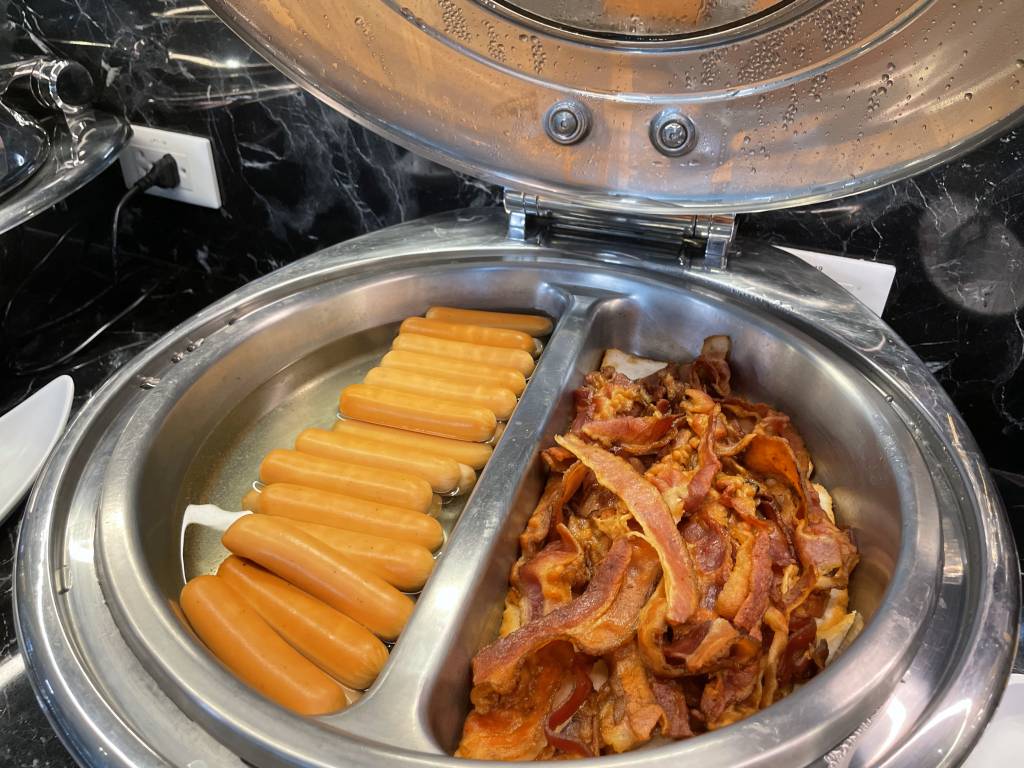 Obwohl es noch früh am Morgen war, dominierten warme Gerichte, wie Schweinegeschnetzeltes und gebratenes Schwein das Angebot. Aber natürlich mussten Frühstücksgäste auch nicht auf Dinge wie Spiegelei, frisches Obst und Sandwiches verzichten. Auch Klassiker wie Speck, Würstchen und Pastries ergänzten das Büfett, wie auch eine Auswahl an Salaten und Gemüse.