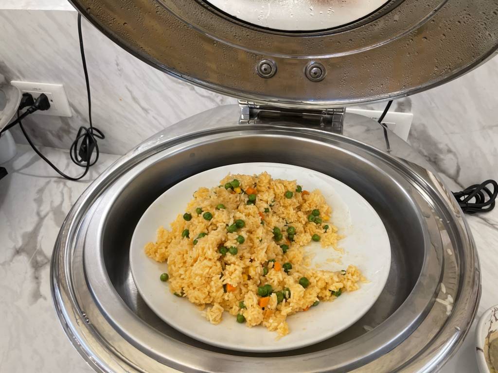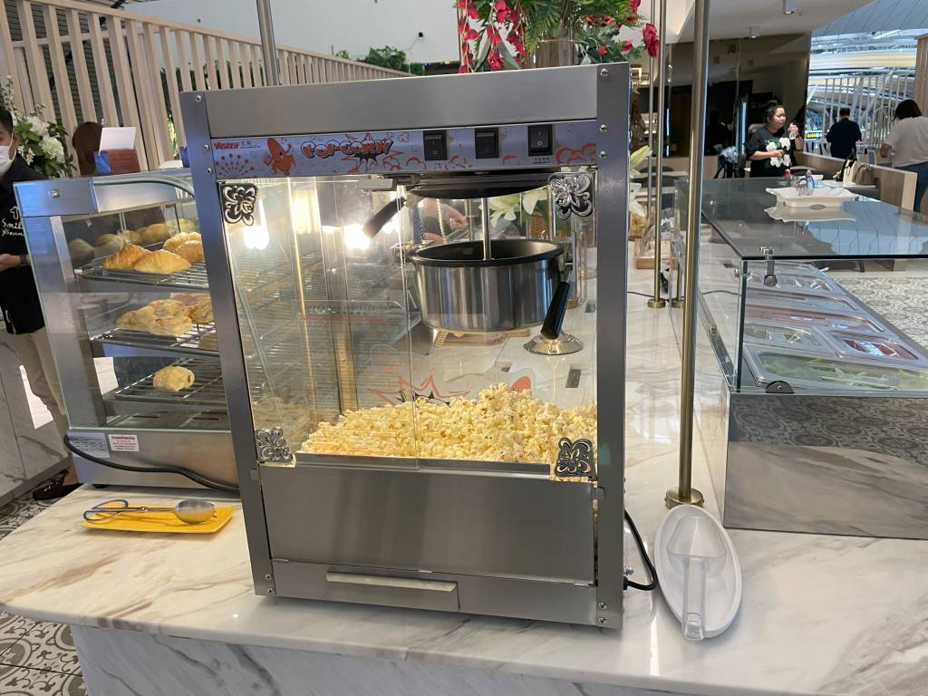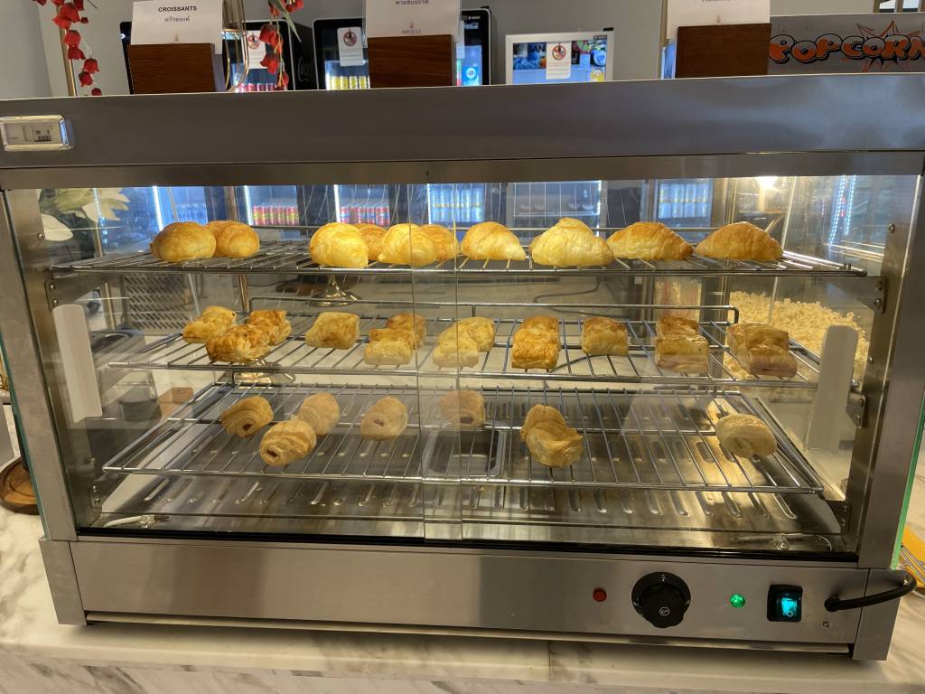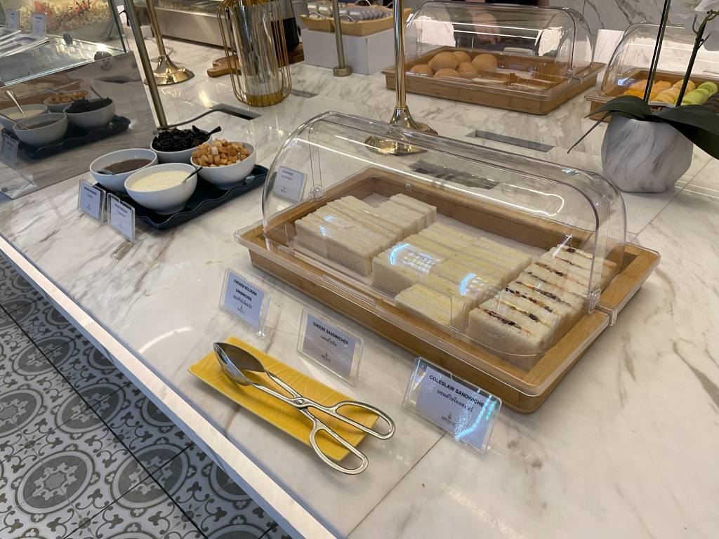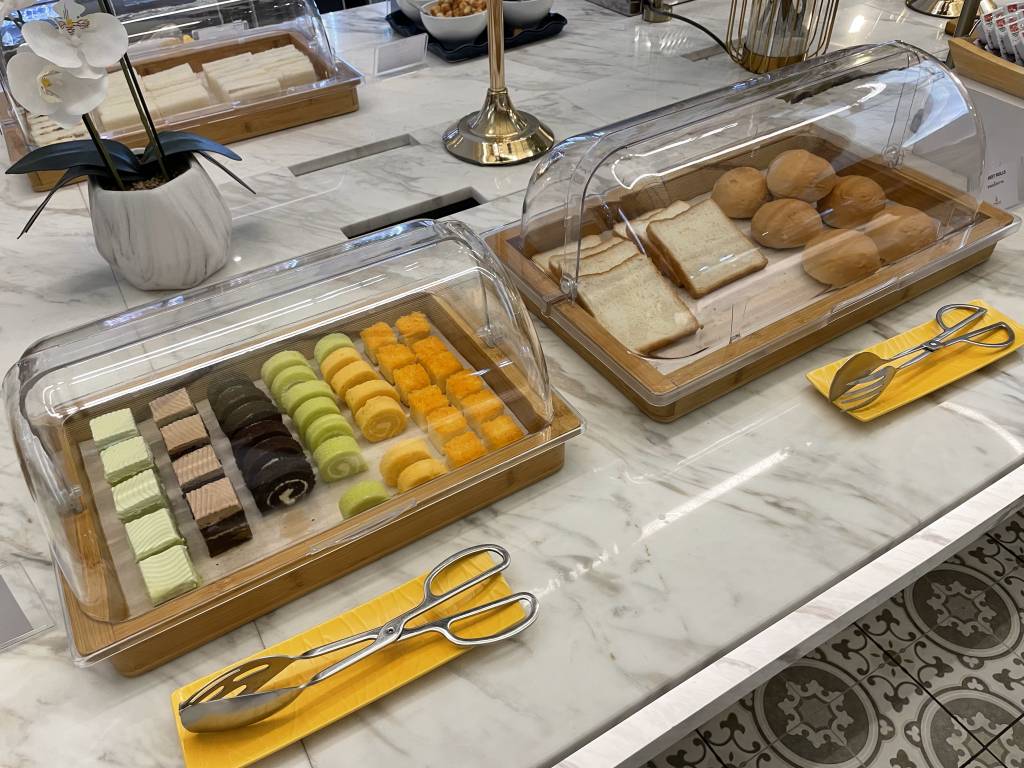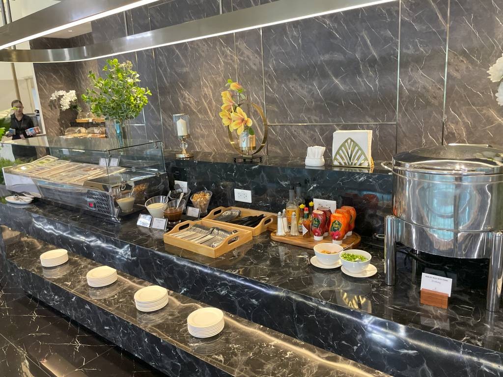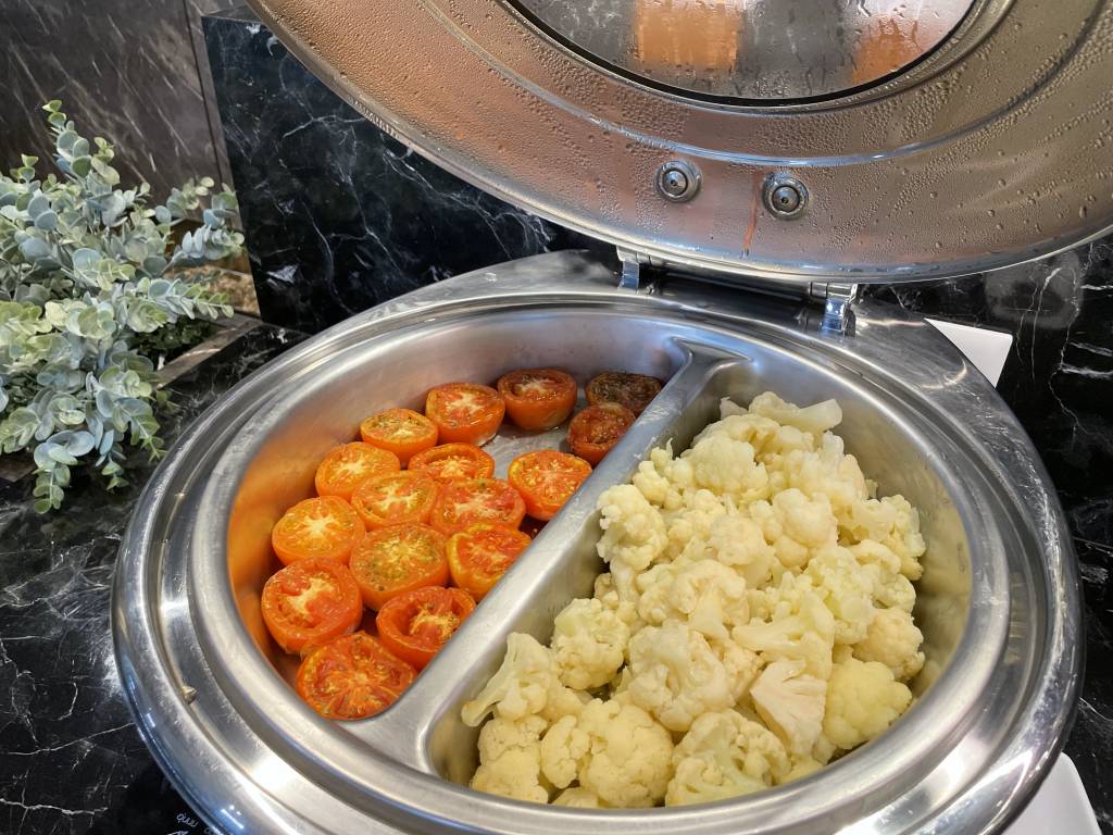Obwohl es noch früh am Morgen war, dominierten warme Gerichte, wie Schweinegeschnetzeltes und gebratenes Schwein das Angebot. Aber natürlich mussten Frühstücksgäste auch nicht auf Dinge wie Spiegelei, frisches Obst und Sandwiches verzichten. Auch Klassiker wie Speck, Würstchen und Pastries ergänzten das Büfett, wie auch eine Auswahl an Salaten und Gemüse.