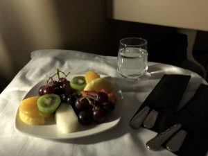 In der Luft wurden dann auch tatsächlich die Getränke zum Aperitif zusammen mit Nüssen zügig serviert. Bei der Menüabfrage darf übrigens jeder Gast individuell entscheiden wann er essen möchte, daher gibt es in diesem Sinne auf keinem Flug einen expliziten  Servicedurchgang. Trolleys und Wagen bekommt man in der Business Class Kabine also nicht zu sehen.