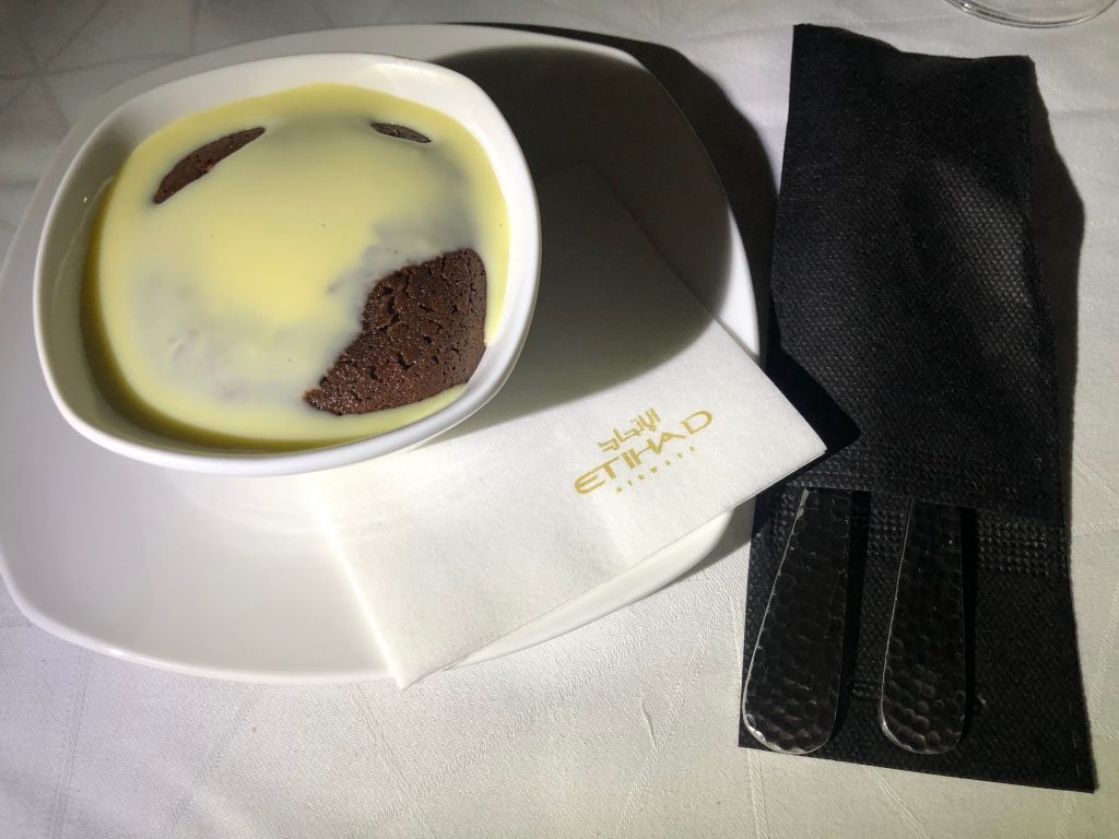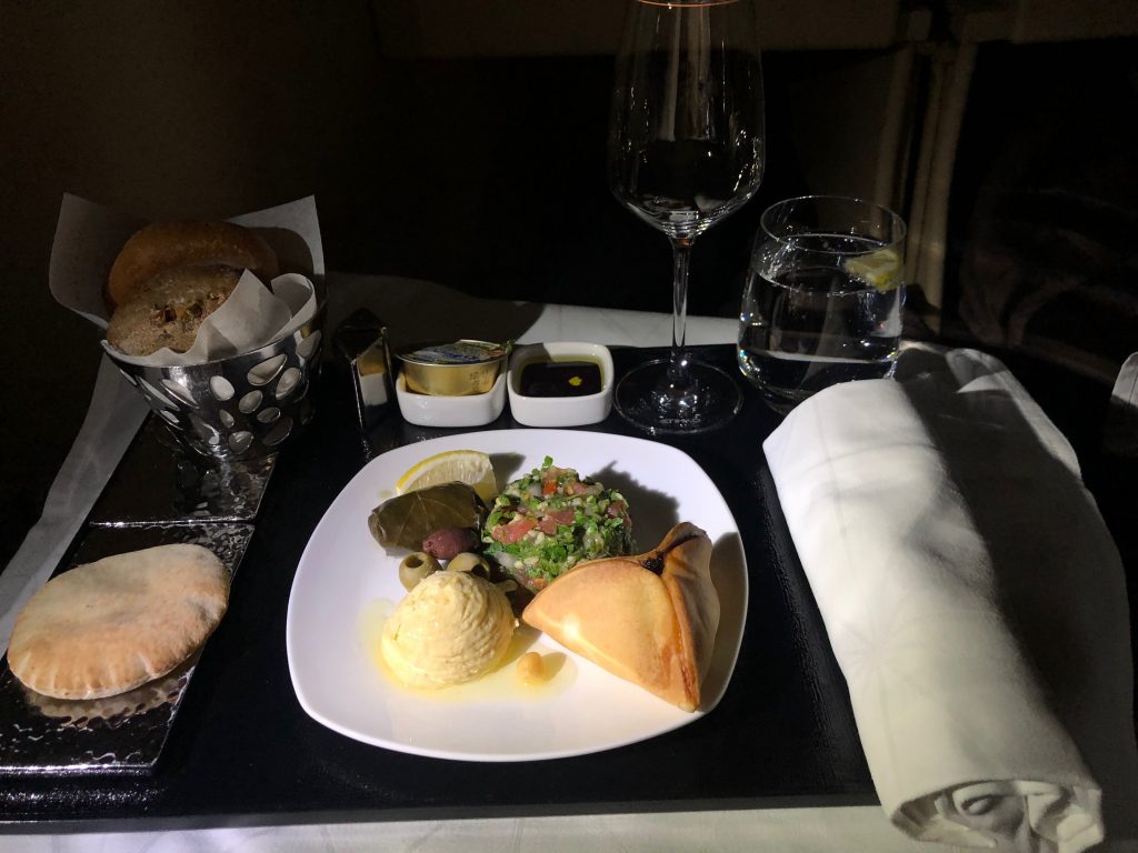 Als Vorspeise habe ich mich für die Mezze entschieden, ein Klassiker bei den Golf-Airlines und passend zu jeder Tageszeit. Der Hauptgang war für mich seit langer Zeit mal wieder ein absolutes Highlight unter den Mahlzeiten im Flugzeug. Die Ochsenbäckchen waren optisch sehr ansprechend und hätten kaum zarter sein können. Das Dessert wurde warm serviert und war ein gelungener Abschluss.
