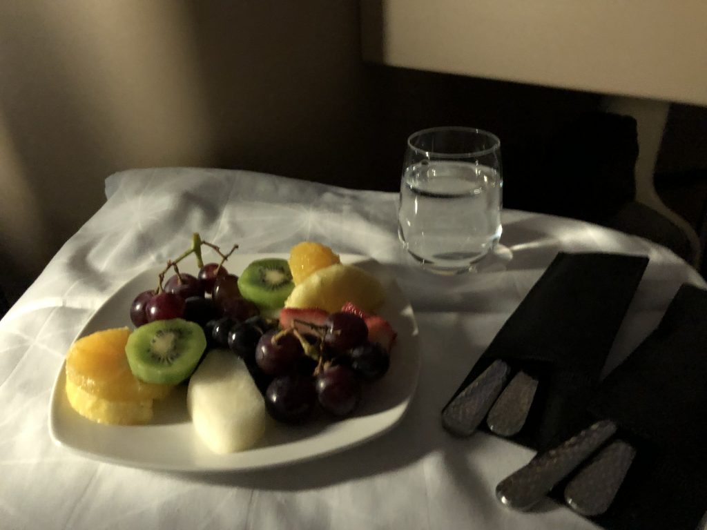 In der Luft wurden dann auch tatsächlich die Getränke zum Aperitif zusammen mit Nüssen zügig serviert. Bei der Menüabfrage darf übrigens jeder Gast individuell entscheiden wann er essen möchte, daher gibt es in diesem Sinne auf keinem Flug einen expliziten Servicedurchgang. Trolleys und Wagen bekommt man in der Business Class Kabine also nicht zu sehen.