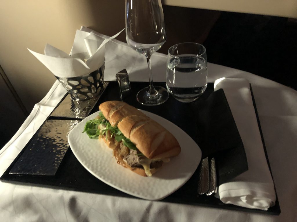 Etwas später wurde meinem Wunsch entsprechend die Menüfolge serviert, Geschmack und Qualität waren wieder überzeugend gut! Leider war jetzt auch schon einer der beiden Rotweine nicht mehr verfügbar, ein Missstand für die Crew sich erneut entschuldigen zu müssen. Da auf diesem Flug die meisten Gäste den Zeitpunkt zum essen individuell gewählt haben, waren die Flugbegleiter sehr konstant in der Kabine unterwegs. Gläser wurden übrigens immer leer gebracht und in einem separaten Gang vor dem Gast eingeschenkt.