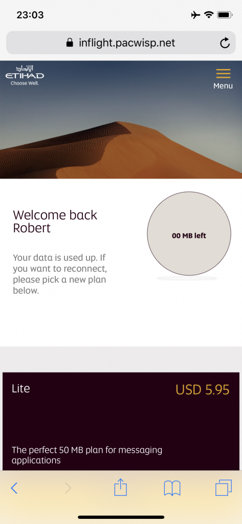 Im Entertainmentsystem wurden viele neue Filme angeboten und die Kopfhörer verfügten über beste Geräuschunterdrückung. Lediglich die Bildschirme waren etwas altbacken und hatten stellenweise eine lange Reaktionszeit. Das Internet war stabil und auf dieser Strecke durchgehend verfügbar. Etihad hatte früher kostenfreies Internet für Premium-Passagiere, das wurde dann auf zeitgebundene Pakete gegen Bezahlung umgestellt. Inzwischen gibt es einen Volumentarif in drei verschiedenen Größen.