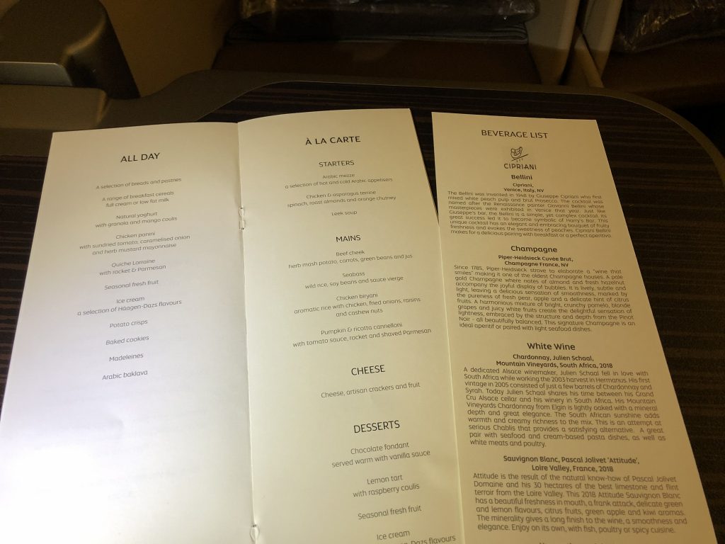 Neben dem 3-Gänge-Menü besteht die Speisekarte zusätzlich aus einem „All-Day-Dining“ Konzept. So kann sich jeder Fluggast nach dem eigenen Rhythmus nur einen Snack, ein Frühstück oder eine vollwertige Mahlzeit bestellen. Bei dem hohen Anteil an Nachtflügen und Transitpassagieren ist das somit optimal gelöst.