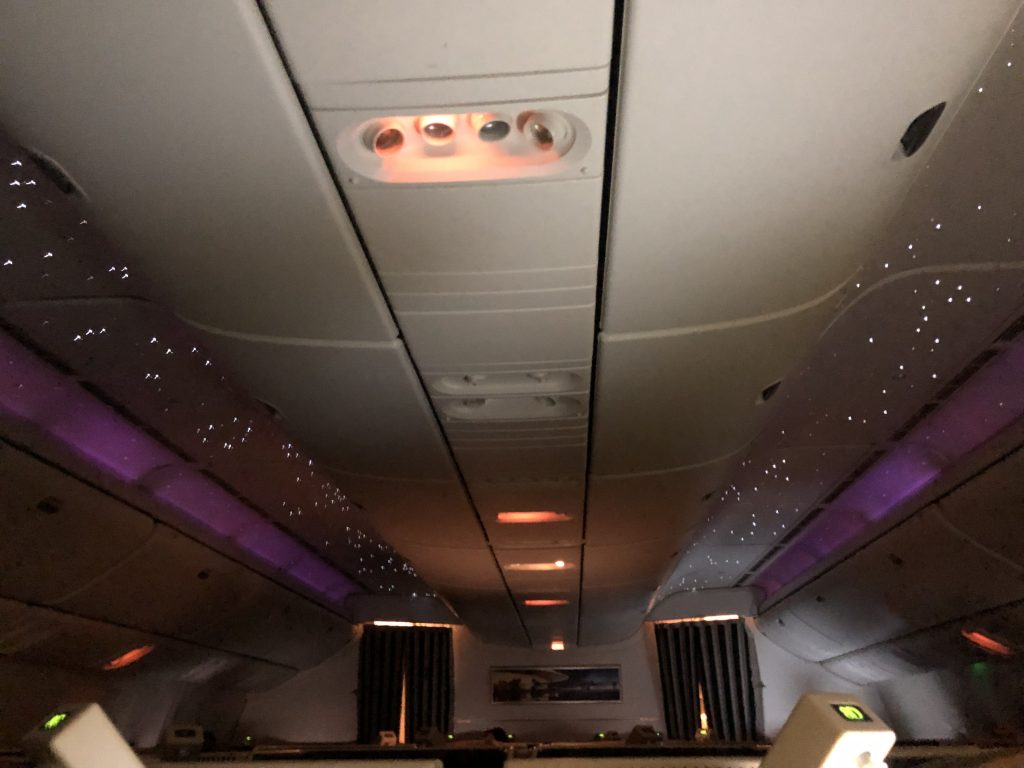 Noch während ich beim Hauptgang war, wurde die Kabine abgedunkelt. Das schummerige Licht und den schönen Sternenhimmel empfand ich als sehr angenehm. Von einem Film habe ich nur den Anfang mitbekommen, denn ich bin schnell eingeschlafen. Als die ersten Vorbereitungen zu Landung vorgenommen wurden, war noch Zeit für einen Espresso. Für die schnelle Einreise wurden noch Fast Track-Karten verteilt, 20 Minuten vor der geplanten Zeit waren wir schon am Gate.