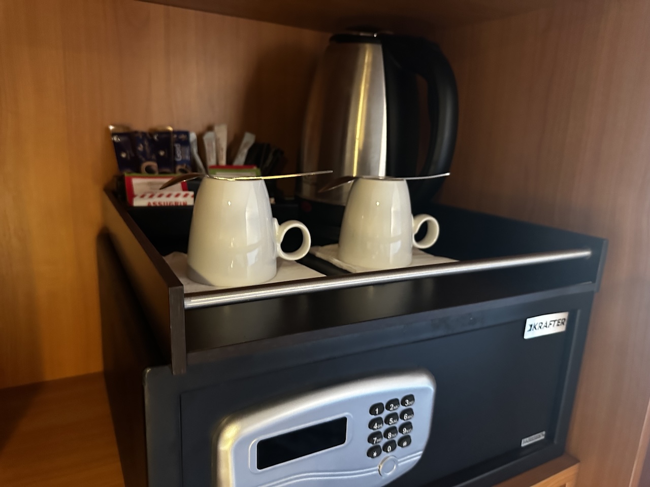 Eine Flasche Wasser, Tee, Kaffee und Wasserkocher sind kostenlos verfügbar, es gab auch einen Kühlschrank und Bügeleisen mit dazugehörigem Brett.