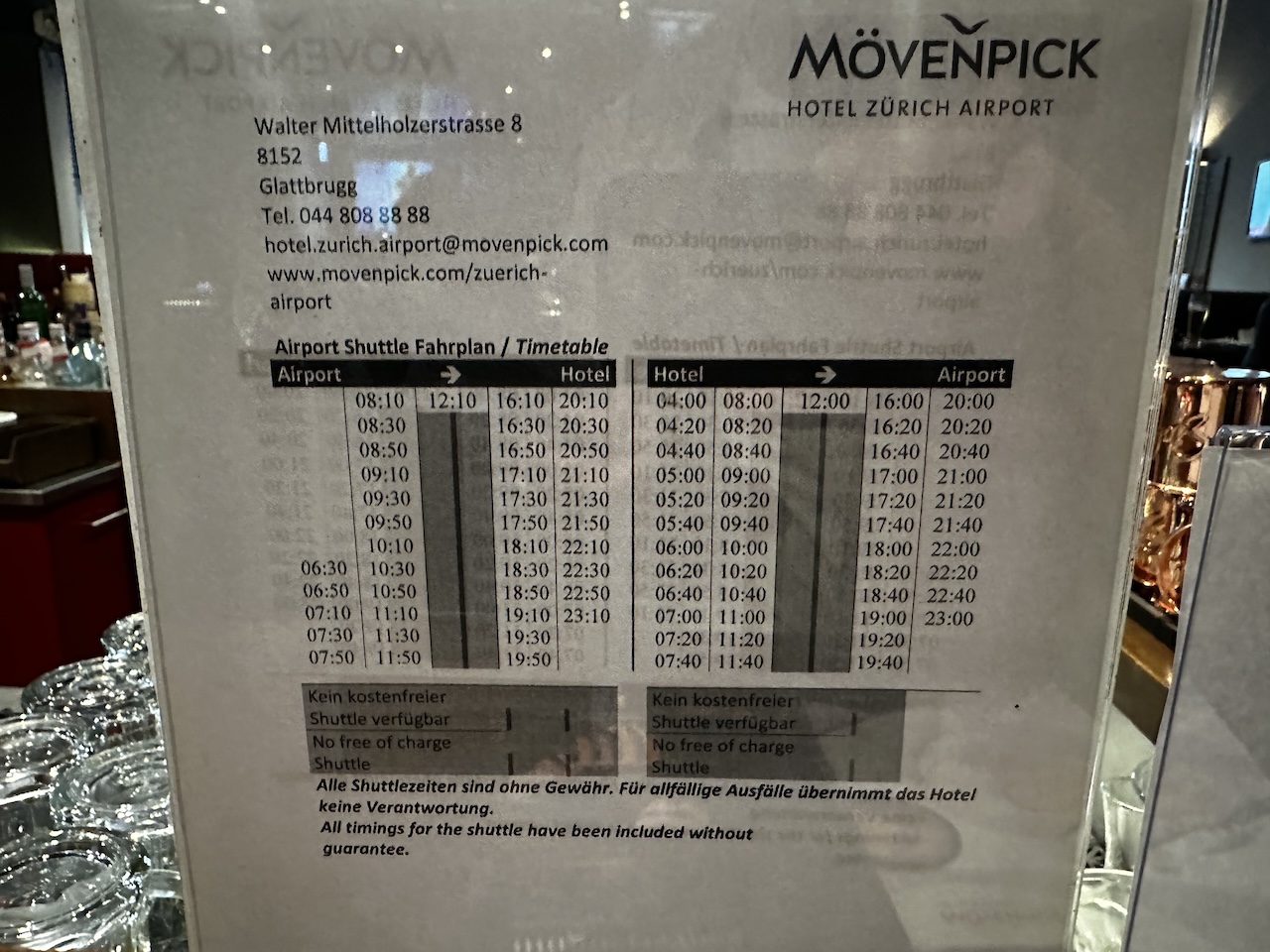 Der Preis war in Ordnung, der Shuttle ist kostenfrei. Ich bin der Meinung, dass Hotels, die den Zusatz Airport im Namen tragen, auch eine entsprechende Anbindung anbieten müssen. Nachteil am Mövenpick-Shuttle: Der Bus verkehrt nicht zwischen 12 und 16 Uhr. In der Regel ist das aber eine Zeit, in der der Sevice kaum genutzt wird. Normalerweise übernachtet man im Flughafenhotel wenn man einen sehr frühen Abflug hat oder spät landet.