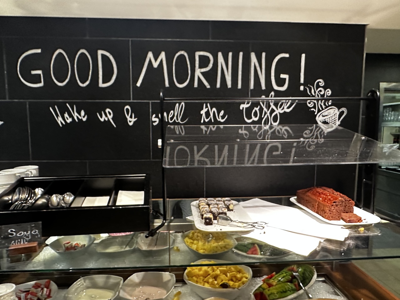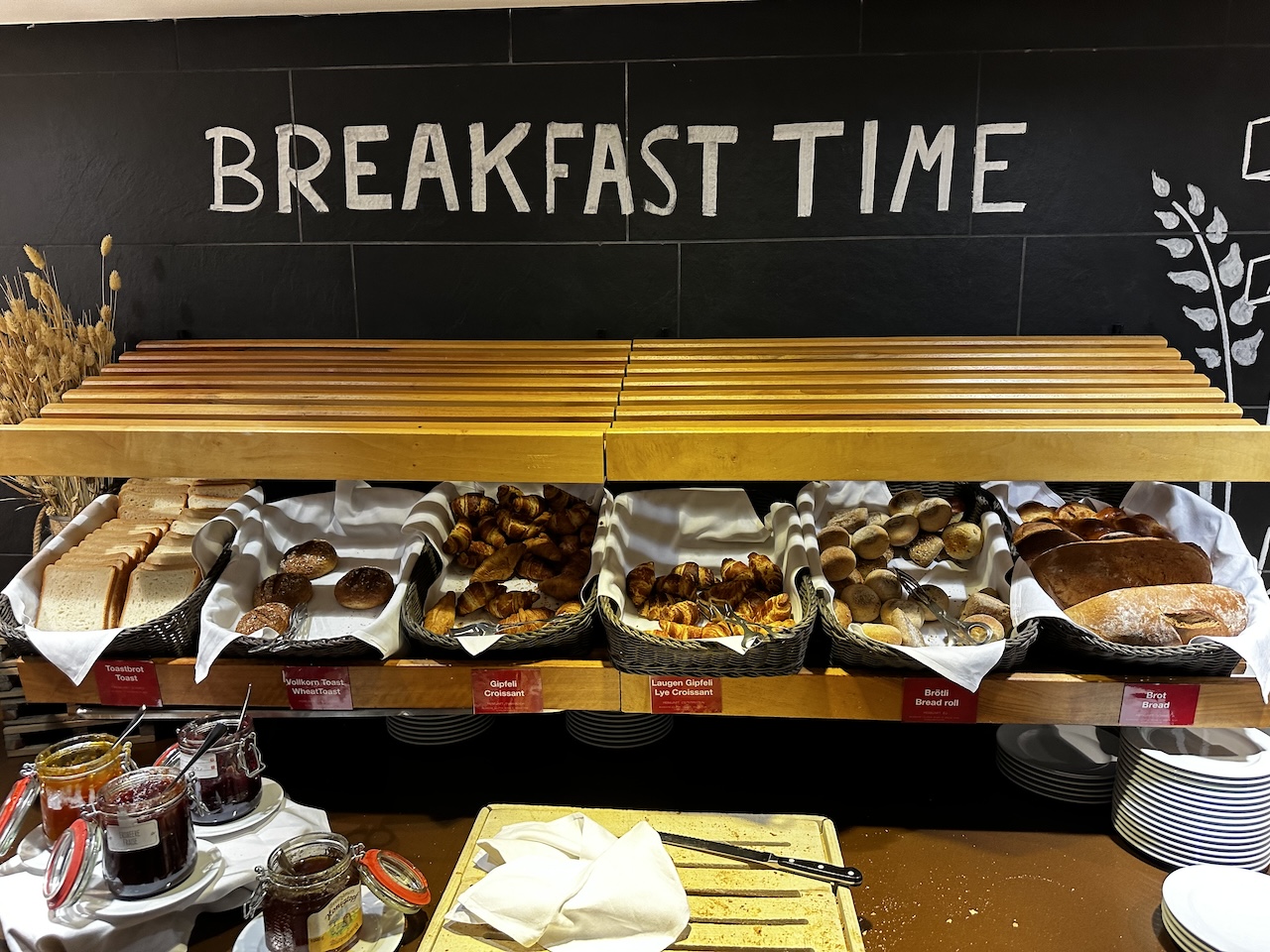 Im Restaurant wird auch das Frühstück serviert, dieses steht als Buffet zur Verfügung. Außer den Frühstücksklassikern wie Brot, Gebäck, Joghurt, Aufschnitt, Obst und Bircher Müsli gab es auch einige warme Optionen und eine Omelette-Station.