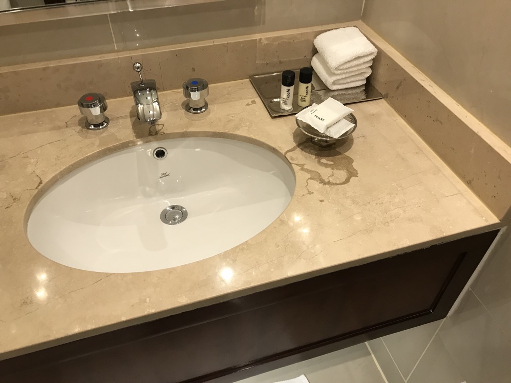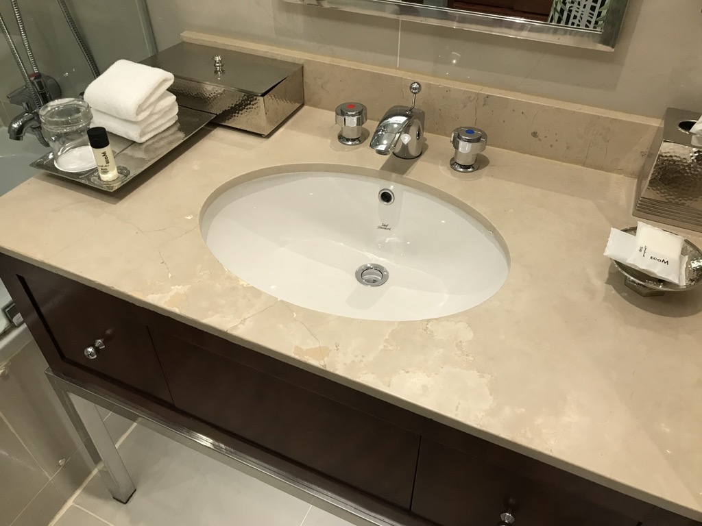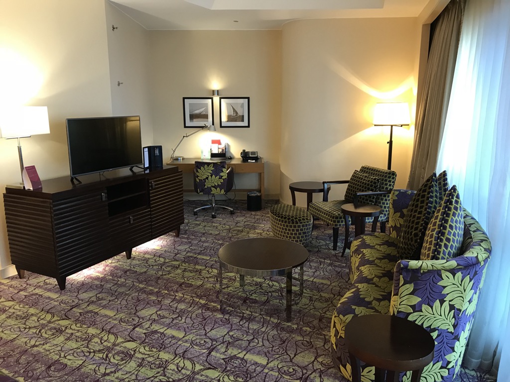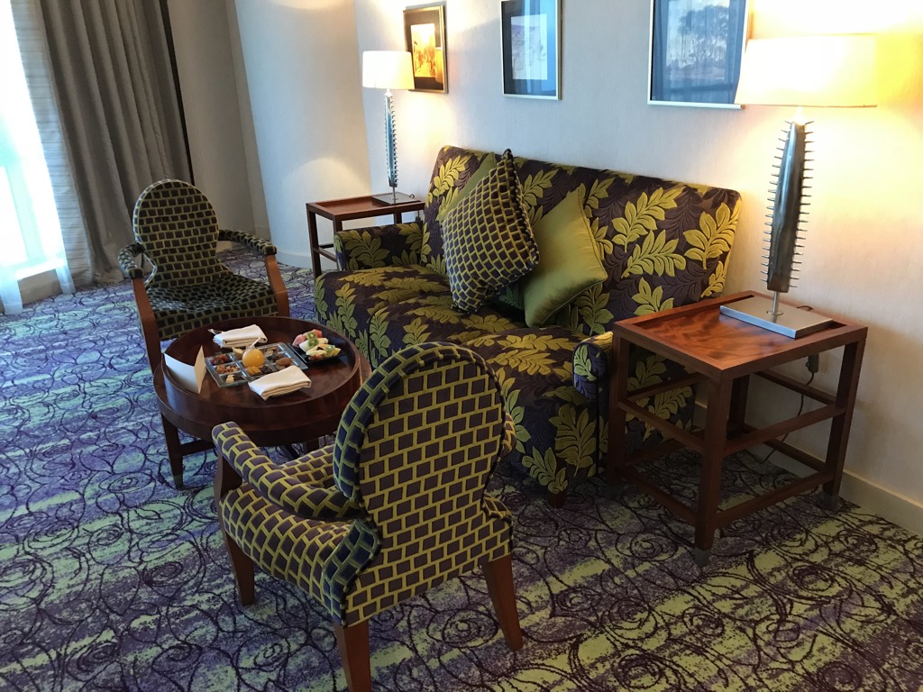 Am Rand der Hotellobby wurden wir an der Rezeption von einer sehr freundlichen Mitarbeiterin begrüßt und eingecheckt. Unsere Daten befanden sich schon alle im Computer, weswegen der Check-In Vorgang sehr zügig abschlossen war. Ursprünglich haben wir einen Superior Sea View Room gebucht, bekamen aber schon beim Check-In ein Upgrade auf eine Executive Sea View Suite, worüber wir uns natürlich sehr gefreut haben. Uns wurde der Weg zum Zimmer erklärt, ebenso wie die Frühstückszeiten und der Zugang zum Internet.