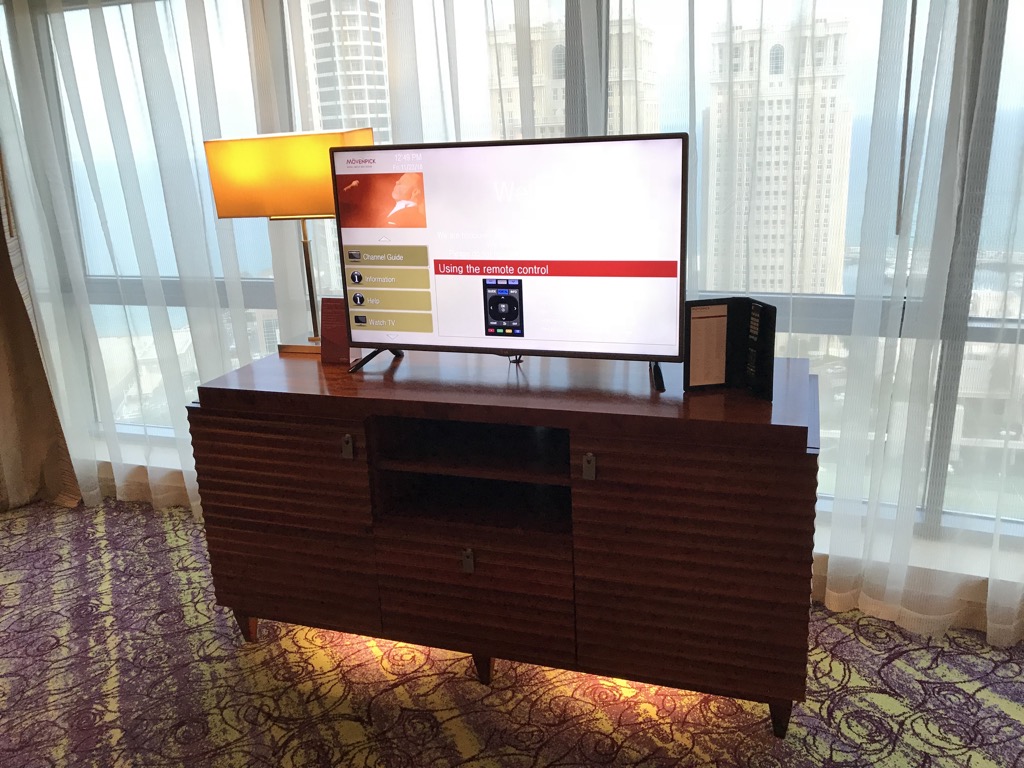 Im Anschluss an das großzügige Wohnzimmer befand sich das Schlafzimmer. Auch von hier aus hatte man einen tollen Ausblick aufs Meer. Zentrales Objekt in diesem Raum war wie üblich das große King Size Bett, welches mit vielen Kissen unterschiedlicher Härtegrade und einer durchgehenden Decke ausgestattet war. Auch gegenüber des Bettes befand sich natürlich ein großer Fernseher.