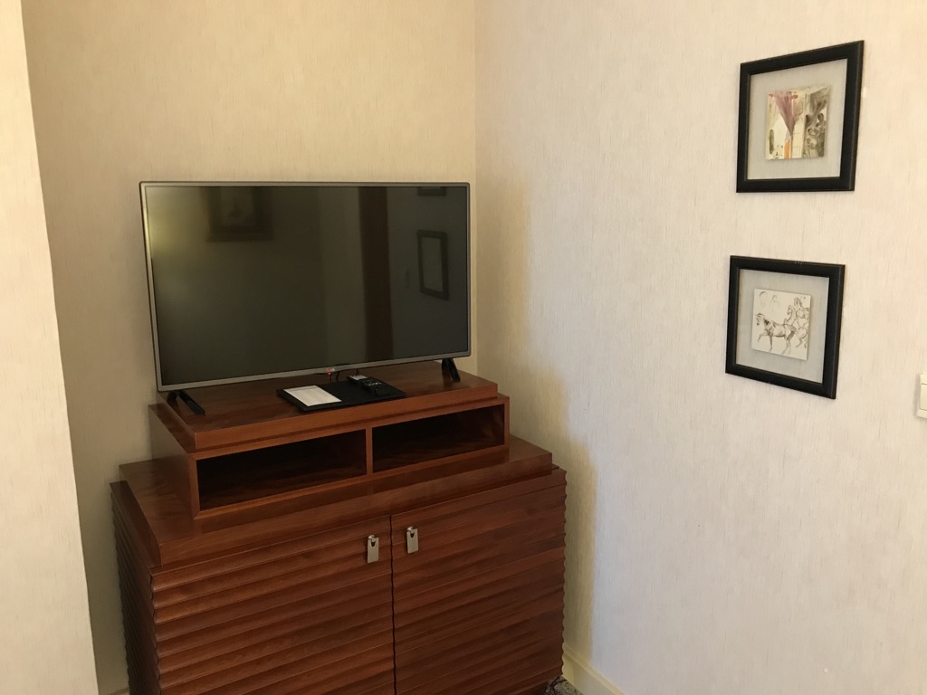 Gegenüber der Küchenzeile stand eine Kommode mit großem Fernseher direkt vor der Panorama-Fensterfront. Bei diesem gelungenen Ausblick lohnt es sich den Fernseher aus zu lassen ;).