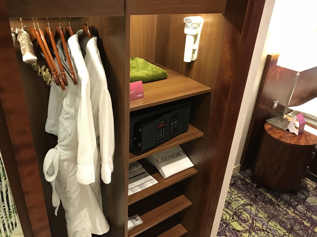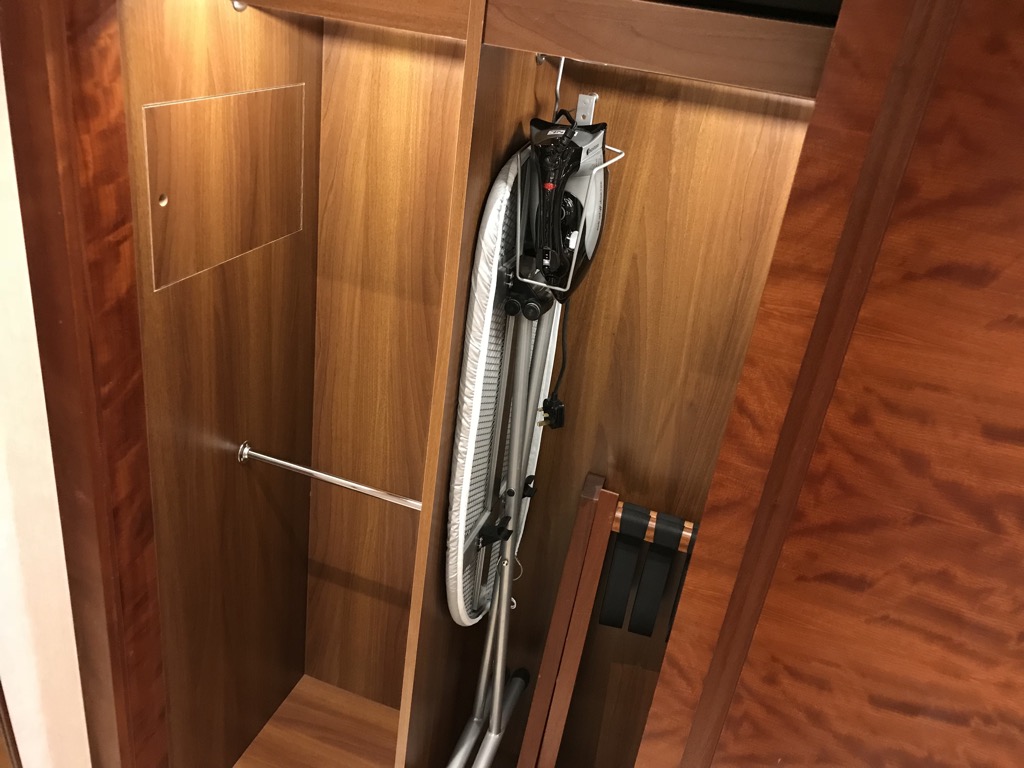 Auf dem Weg vom Schlafzimmer zum Badezimmer kam man an einer Schrankwand vorbei, in welcher sich der Safe, Hausschuhe, Bademäntel und ein Bügelbrett befanden.