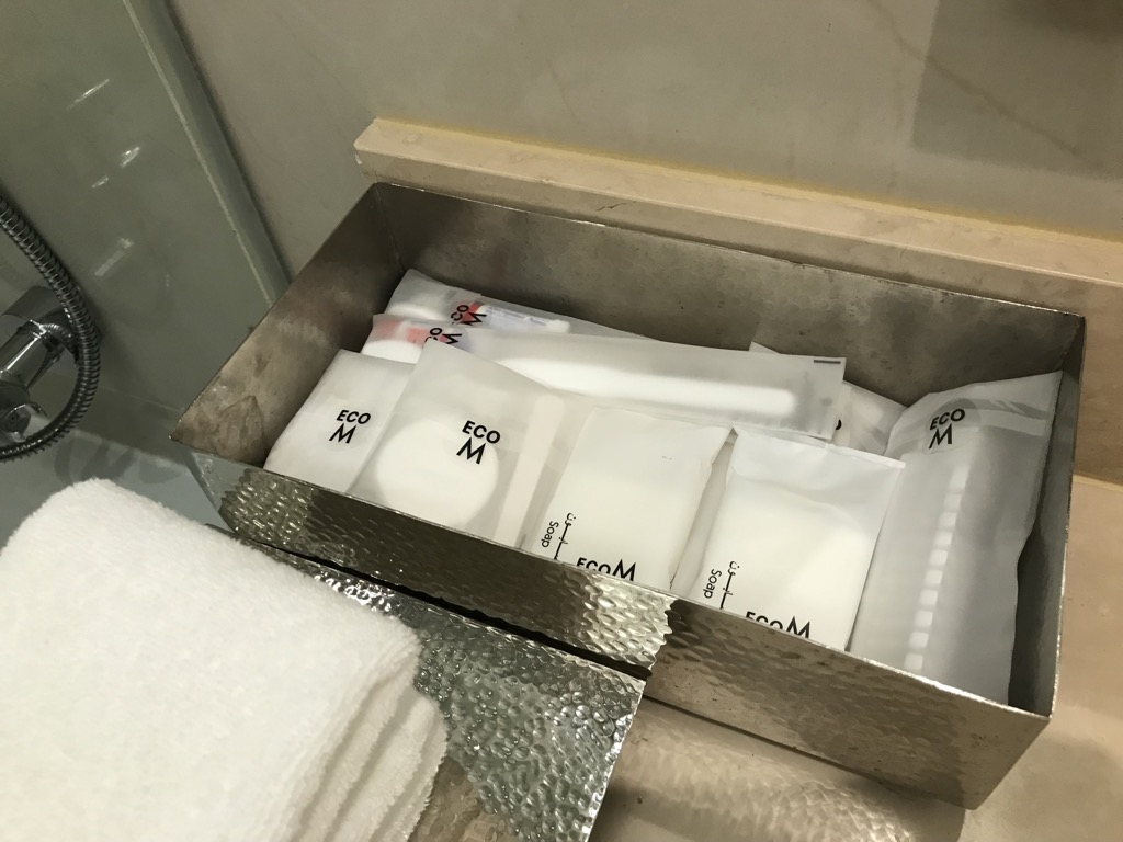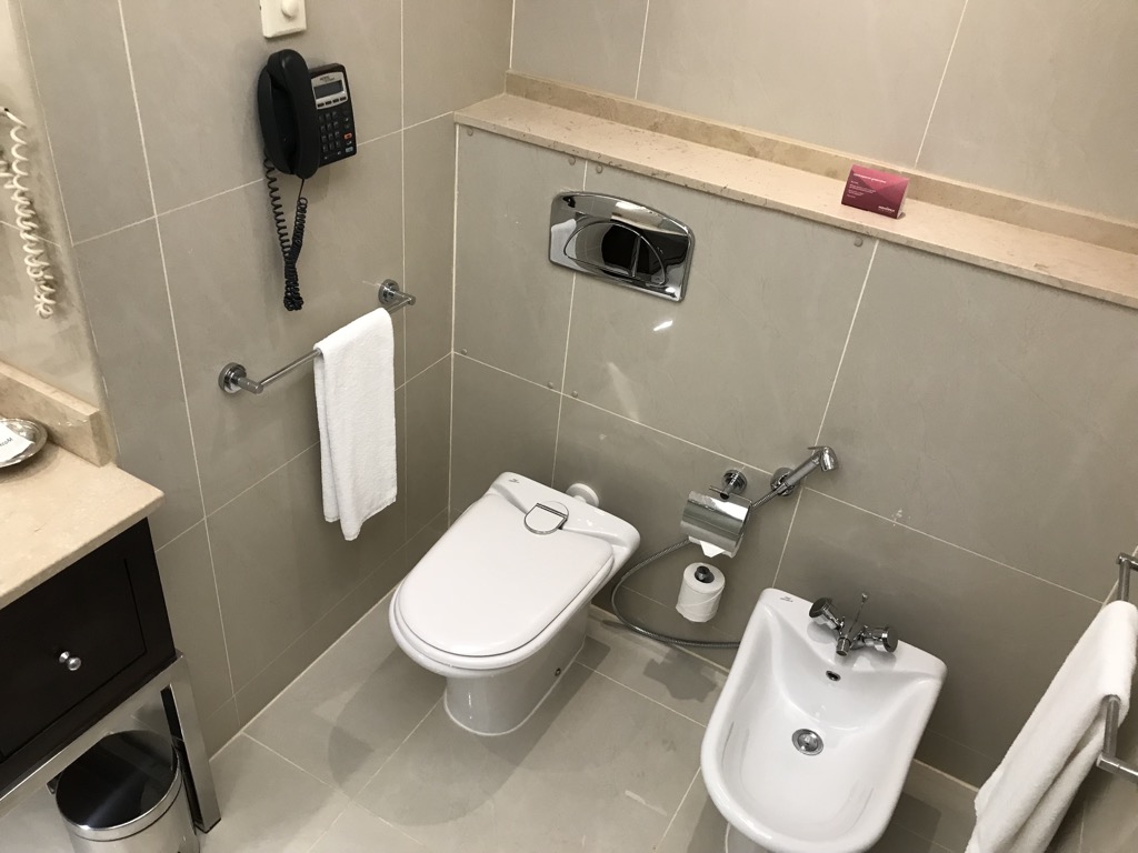 Gegenüber der Schrankwand befand sich das Badezimmer. Hier war neben der Toilette ein Bidet und ein großzügiges Waschbecken mit viel Ablagefläche installiert, auf welchem bereits eine komplette Auswahl an Amenities auf uns wartete. Die Amenities wurden täglich aufgefüllt, es hat uns also nie an etwas gefehlt.