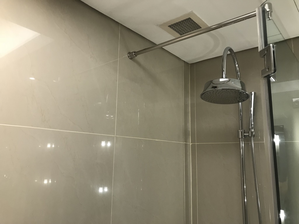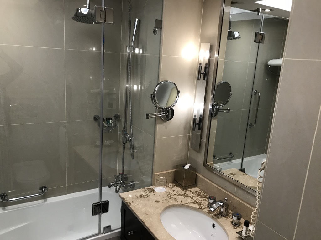 Neben dem Waschbecken befand sich eine Duschbadewanne mit einem Regenduschkopf, weiteren Amenities und einer Auswahl unterschiedlich großer Handtücher.