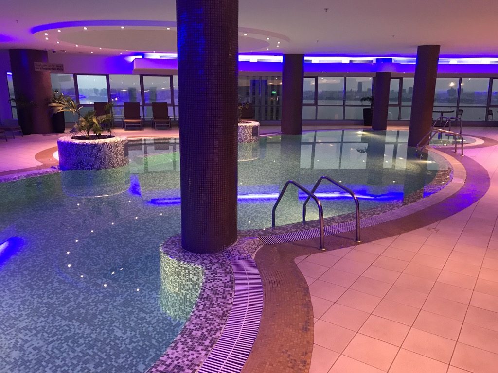 Auf dem obersten Stockwerk befand sich der schön gestaltete Innenpool. Hier war der Ausblick noch beeindruckender als aus unserem Zimmer auf dem 17. Stockwerk. Der Pool hatte eine angenehme Wassertemperatur und die komplette Beleuchtung des Raumes war in einem warmen Licht gehalten. Um den Pool herum standen einige Liegen und Handtuchständer. Zu den Pool Öffnungszeiten war immer ein Angestellter in der Nähe der das Areal in einem einwandfreien Zustand hielt.