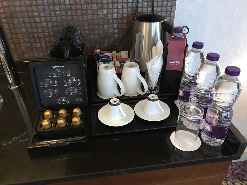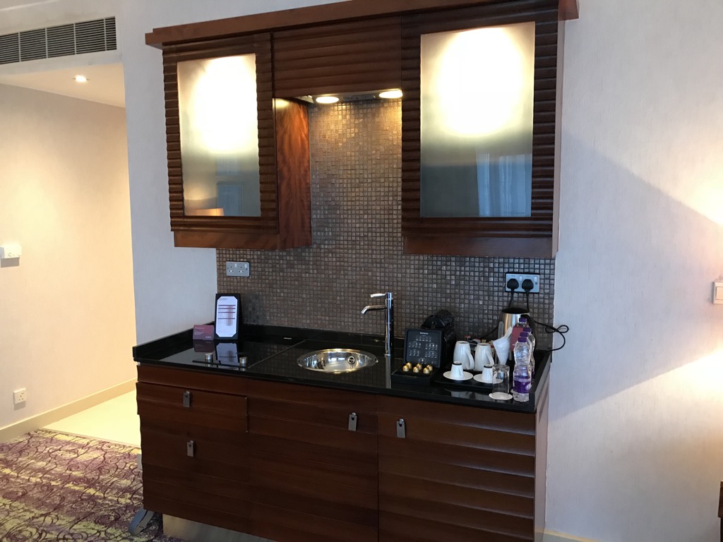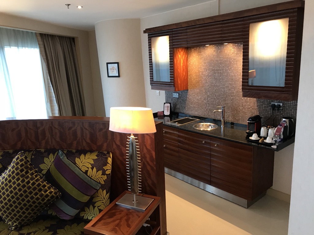 Direkt nach dem Betreten der Suite befand sich auf der linken Seite ein Gäste-WC. Ging man an diesem vorbei, stand man in dem großen Wohnzimmer. Auf der linken Seite befand sich eine kleine Küchenzeile, auf der die Kaffee- und Teestation mit Wasserflaschen untergebracht war. Unten im Schrank war noch eine gefüllte Minibar eingebaut.