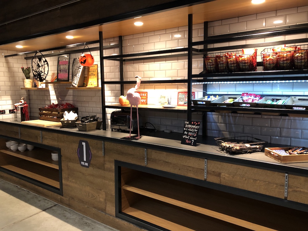 Man kann sich mit Snacks und Getränken versorgen, Frühstück gibt es als Buffet im selben Bereich.