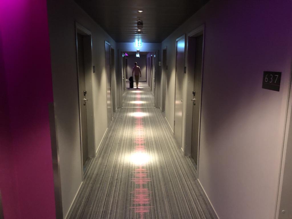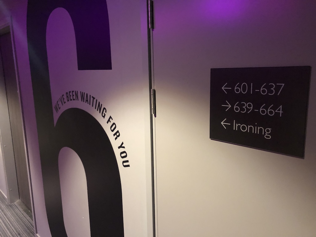 Gäste, die bereits in einem Moxy waren, haben bereits in der Lobby einen großen Wiedererkennungseffekt. Auf den Etagen ist es genauso, Farben und Teppichboden sind identisch mit dem der anderen Hotels. Da es keine Bügeleisen auf den Zimmern gibt, werden Brett und Eisen in einem gesonderten Raum bereitgestellt.