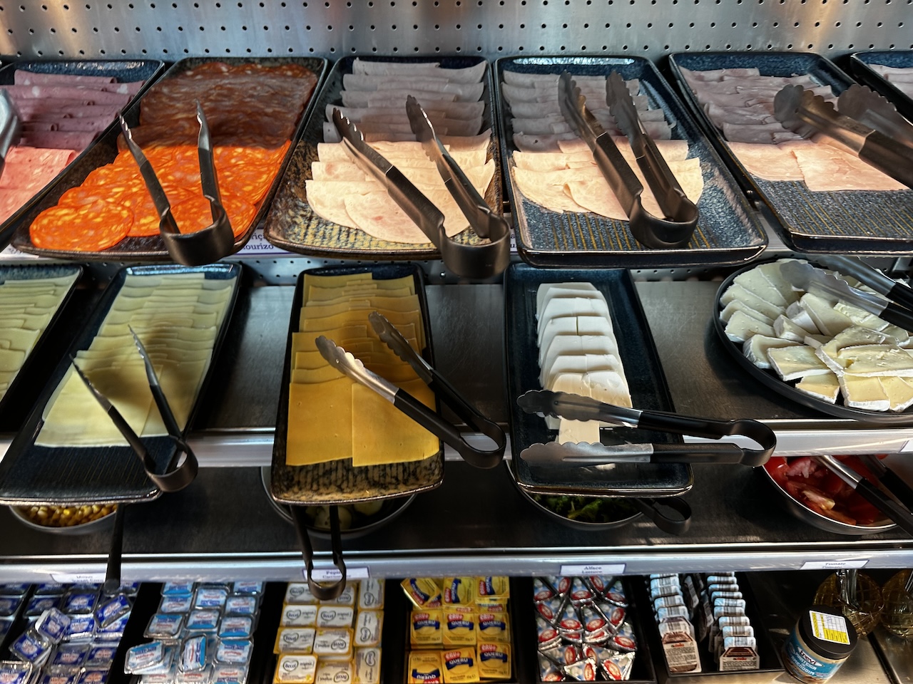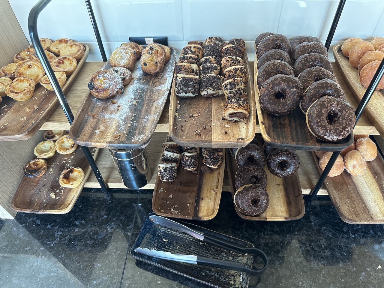 Um 6 Uhr startet das Buffet, welches um 10:30 Uhr abgeräumt wird. Zur Auswahl gab es Aufschnitt, Obst, Joghurt, Müsli, Salat und auch warme Dinge wie Rührei und Pfannkuchen.