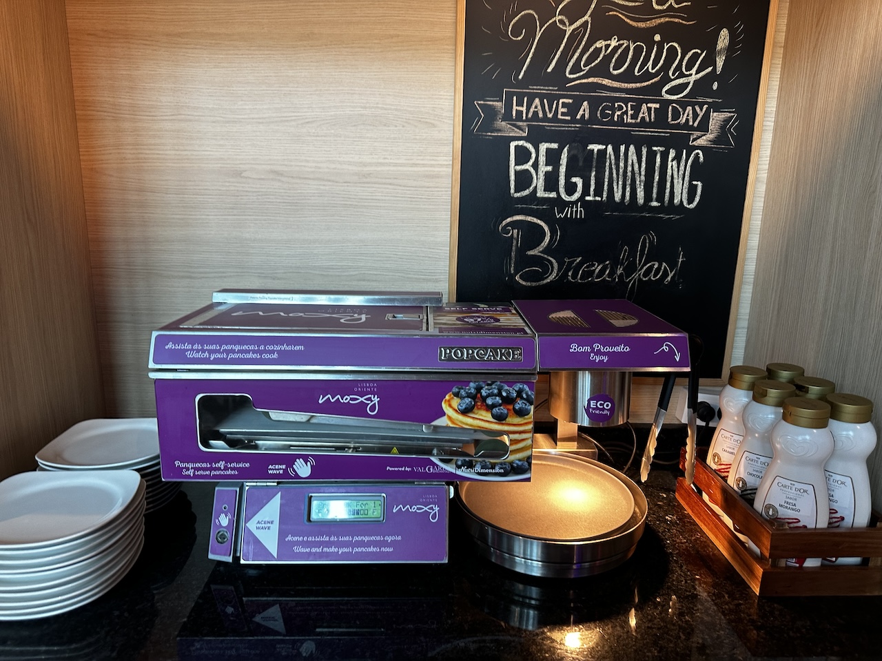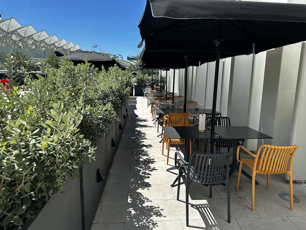 Kaffee kommt – genau so wie Säfte und Wasser – aus einem Automaten. Alles nichts besonderes, aber auch nichts schlechtes. Für den zweiten Kaffee und ein Pasteis de Nata bin ich dann in den Außenbereich, wo es trotz der Straße ganz gemütlich war.