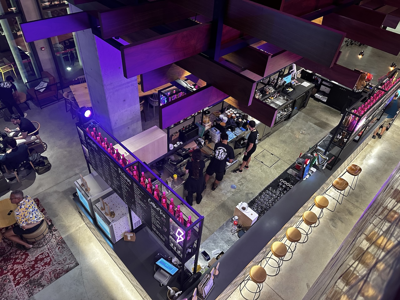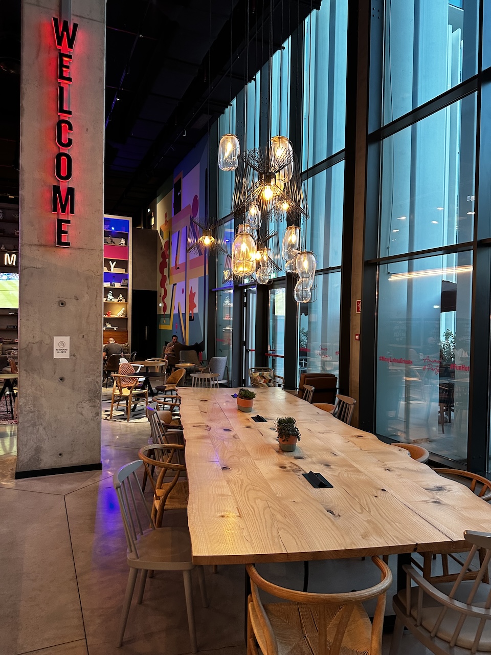 Es stehen viele gemütliche Sitzgelegenheiten bereit, man kann sich Drinks ordern und aus einem Snack Menü bestellen. Wer hier Ruhe sucht und z.B. arbeiten will ist aber fehl am Platz, dafür sind Hintergrundgeräusche und Musik zu laut.