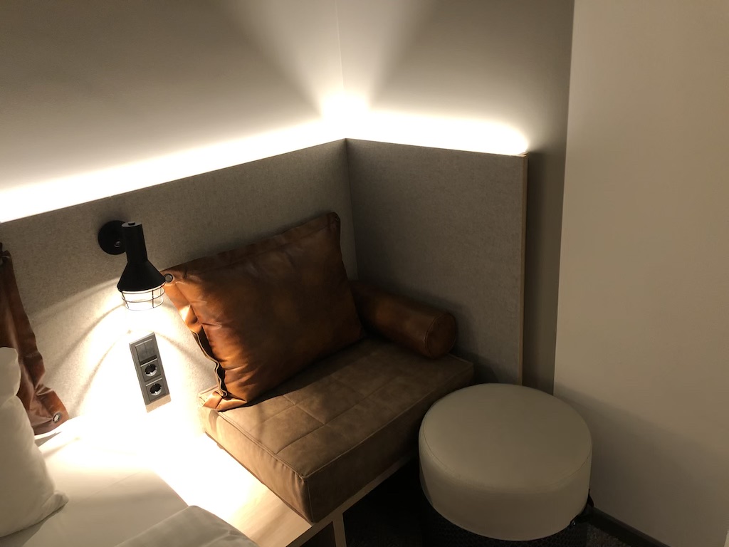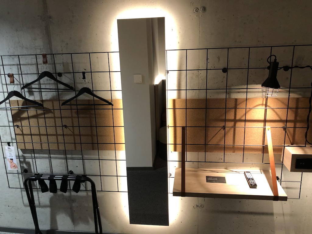 Die indirekte Beleuchtung sorgt für eine angenehme Atmosphäre. An der Garderobe ist eine kleine Ablage installiert, die auch als Tisch genutzt werden kann. Das WLAN ist schnell, kostenfrei und ohne Passwort nutzbar.